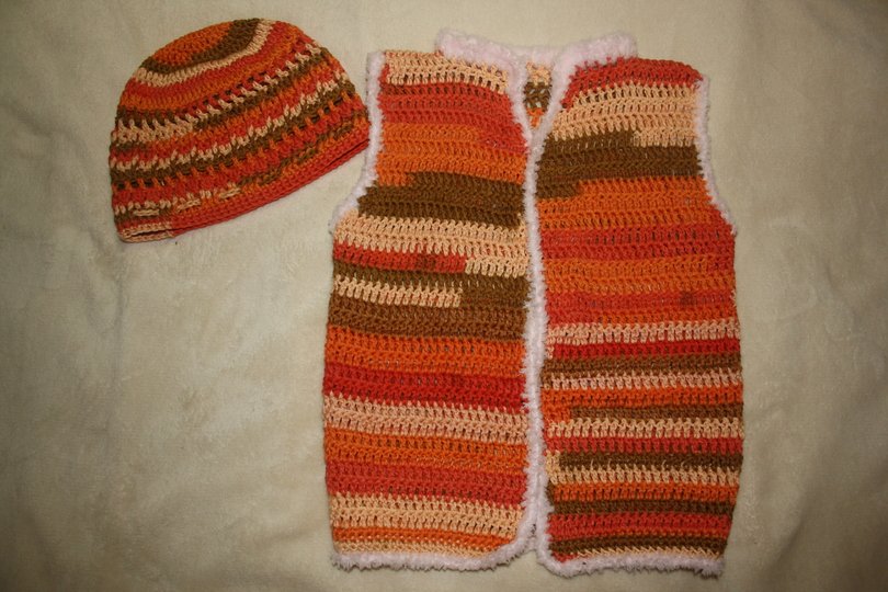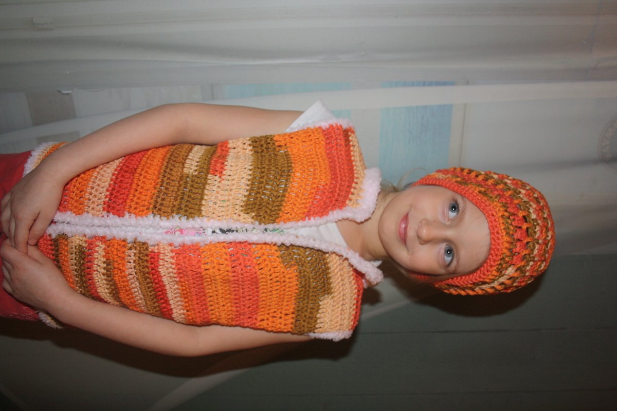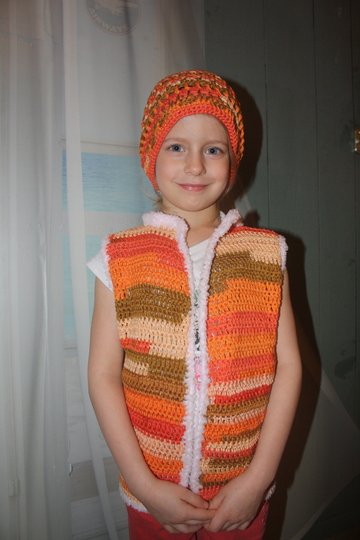 Set aus Weste Gr.116 und Haube Gr. 47-50 cm. Vorkenntnisse wie Fm,Km,Stb,Rstb oder Lm sollten vorhanden sein Diese Anleitung ist gut für Anfänger geeignet.