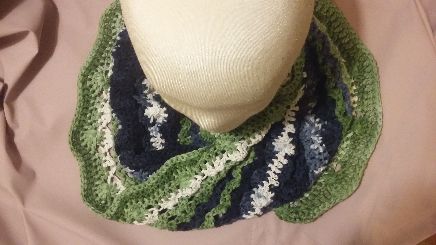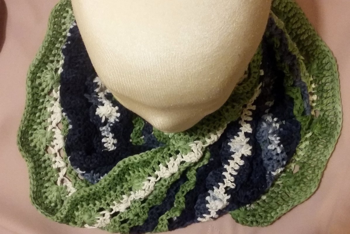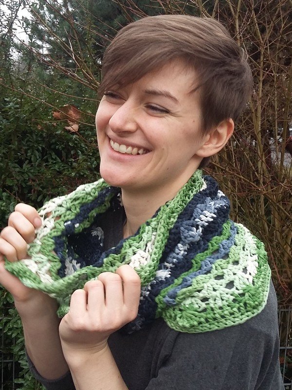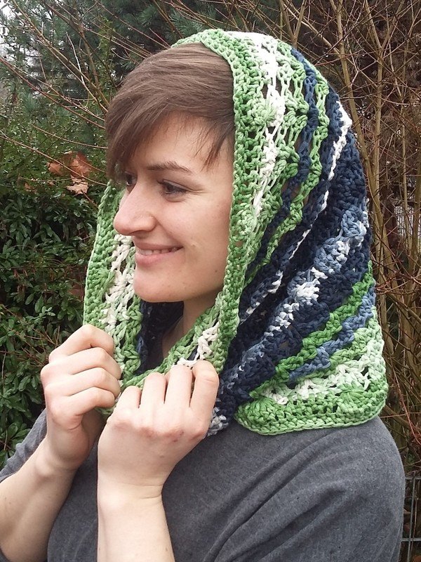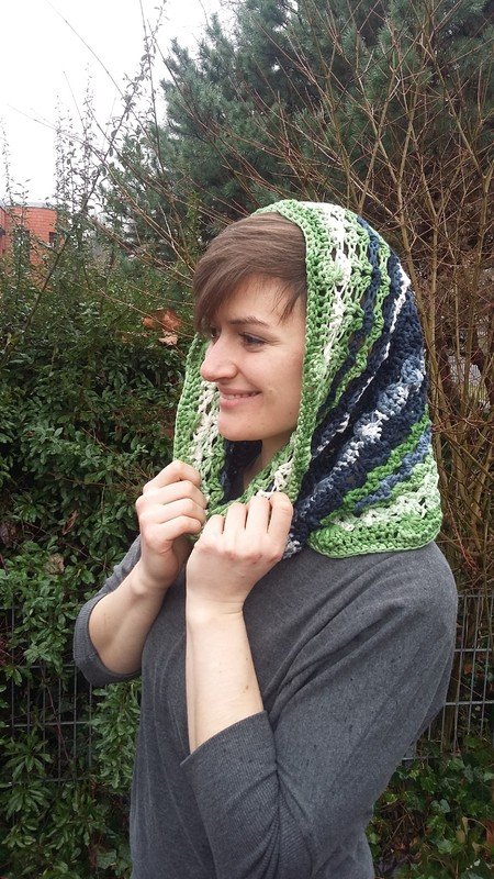 Ein wunderbares Geschenk oder für sich selber. In meinem Beispiel habe ich Baumwollgarn gewählt. Natürlich kann er auch aus Lacegarn gearbeitet werden. Der Schal ist in sich einmal verdreht und liegt somit perfekt um den Hals. Als Schutz vor Sonne oder Wind, läßt er sich bequem über den Kopf tragen.