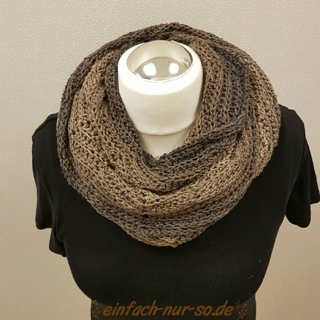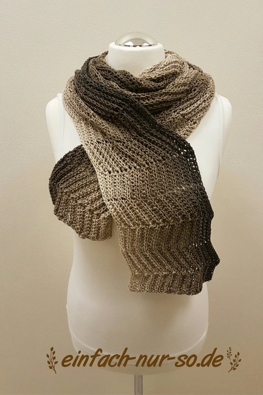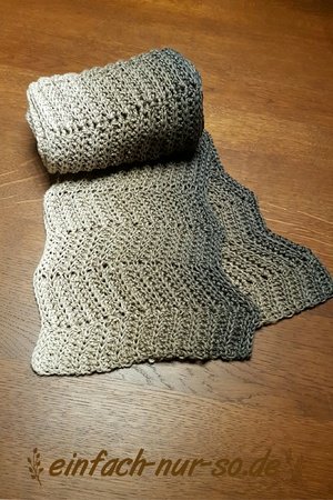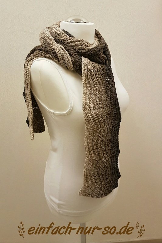Der Schal wird in der Länge gehäkelt und kommt daher sehr gut zur Geltung wenn er mit Farbverlaufsgarn gehäkelt wird.