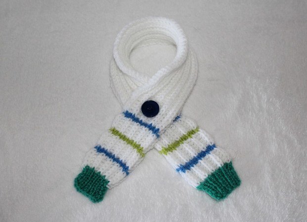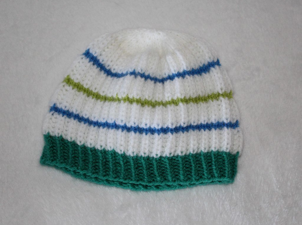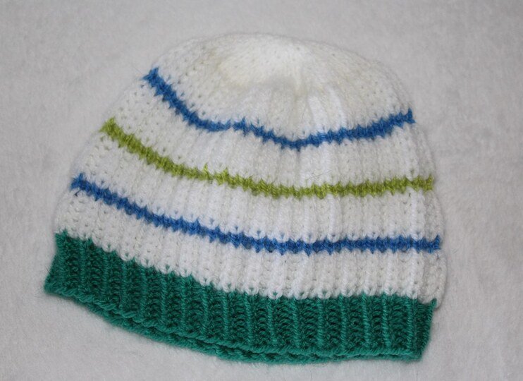 Für dieses Baby-Set im Patentmuster benötigen Sie lediglich 2 Knäuel Wolle in einer Grundfarbe (hier Weiss), sowie Reste in 3 weiteren Farben. Es wurde hier Bravo von Schachenmayr verwendet (Lauflänge 133 m / 50 g).