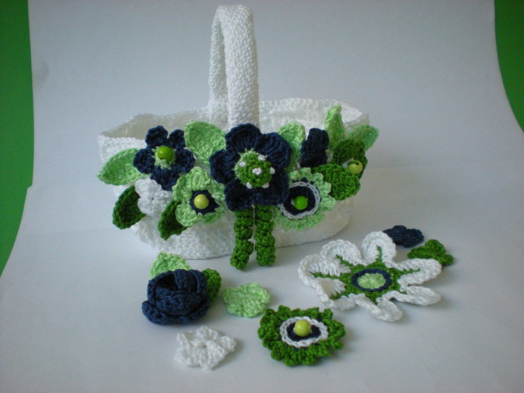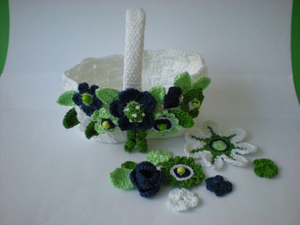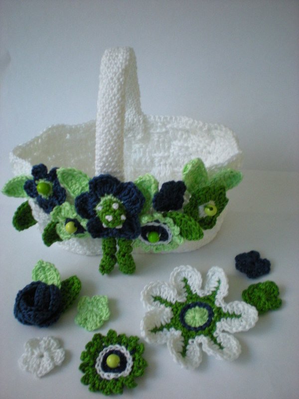 Das Körbchen ist aus Baumwolle mit einer Lauflänge von 125 m je 50 g gehäkelt. Die Anleitung ist ausführlich beschrieben und bebildert. In der Anleitung findest Du verschiedene Blümchen, sodaß Du entscheiden kannst, welche Du zum verzieren nehmen möchtest.