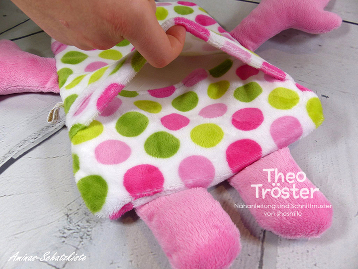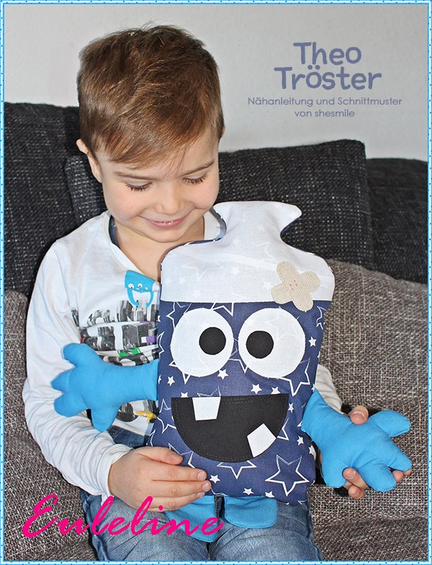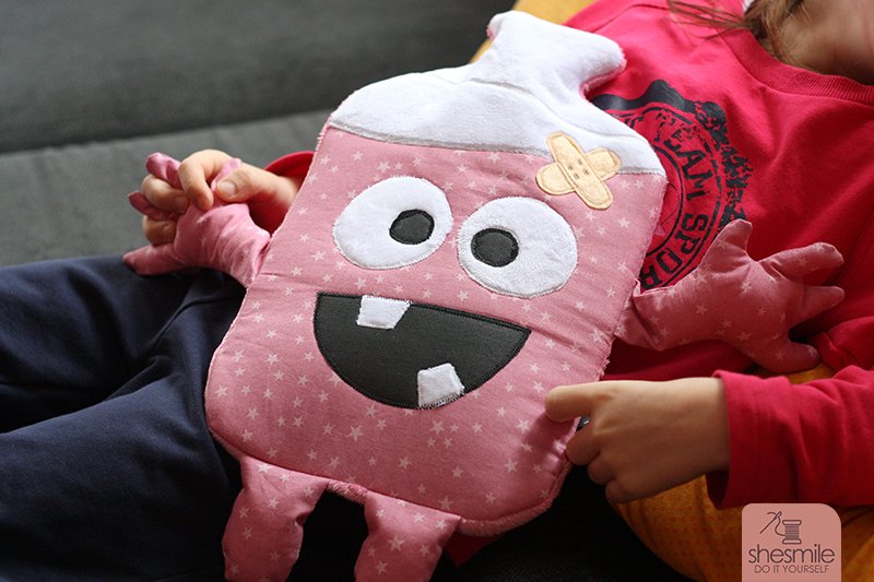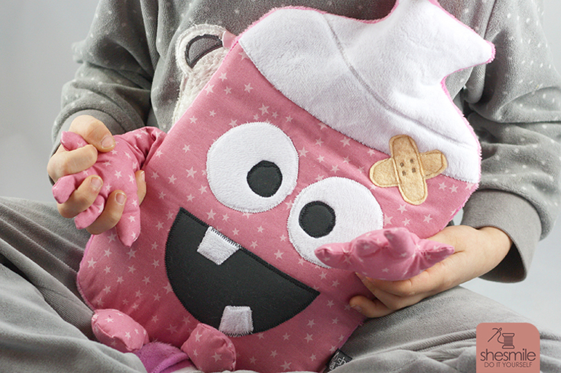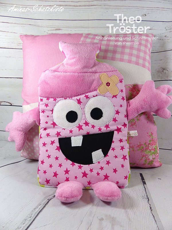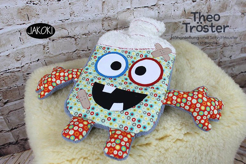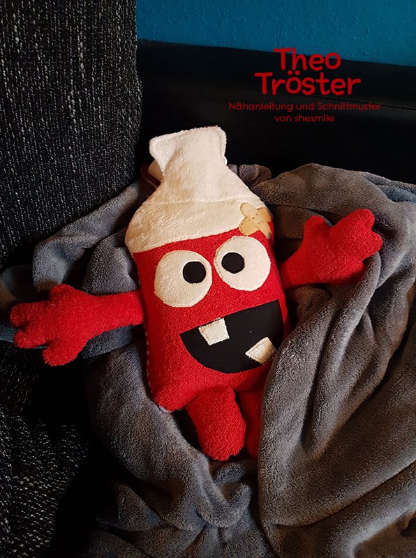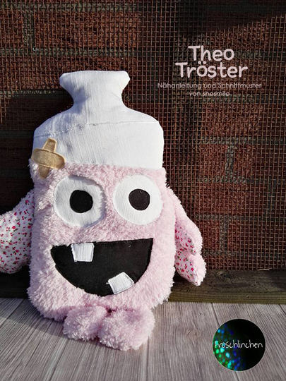 Von mir gezeichnet, entworfen und umgesetzte Nähanleitung und Schnittmuster für einen fröhlichen Wärmflaschenbezug "Theo Tröster".