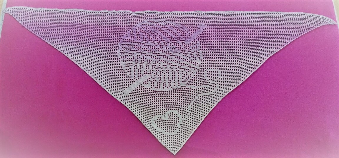 Das fertige Tuch wurde mit ca. 850 / 950 Metern 3- fach gefachtes Farbverlaufsgarn mit einer Nadelstärke 3 gehäkelt. Das Tuch hat folgende Masse: ca. 185 cm lang (von Ecke zu Ecke) x 73 cm breit (von Mitte zur Spitze)