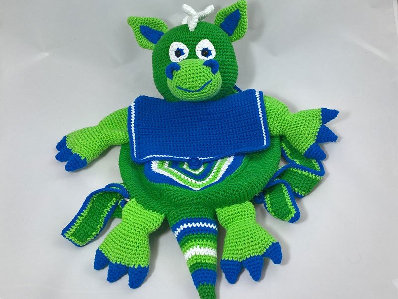 Ich habe Baumwollgarn mit 50 g /90 lm von Lana Grossa "Star" genommen - das geht aber mit jedem Baumwollgarn in dieser Lauflänge. Da gibt es auch günstigeres Topflappen - Garn , der Dino ist doch ein kleiner verfressener beim Material :-) - doch das Ergebnis lohnt sich.