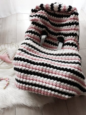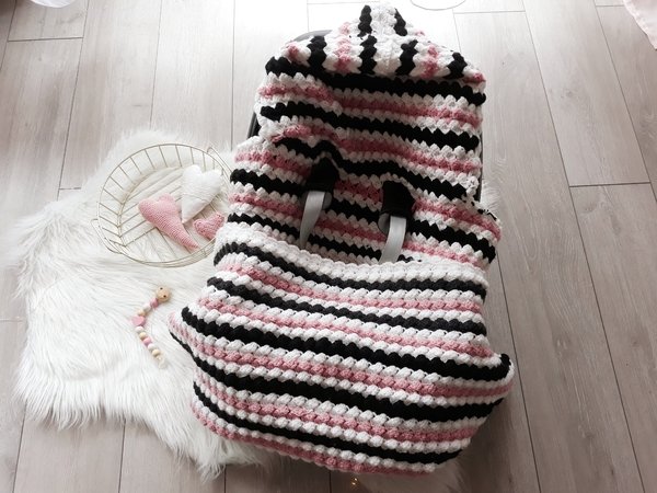 Die Einschlagdecke passt in eine Babyschale mit Dreipunktgurt sowie einem Kinderwagen, der diesen Gurt hat!