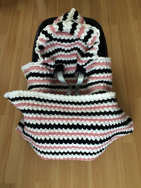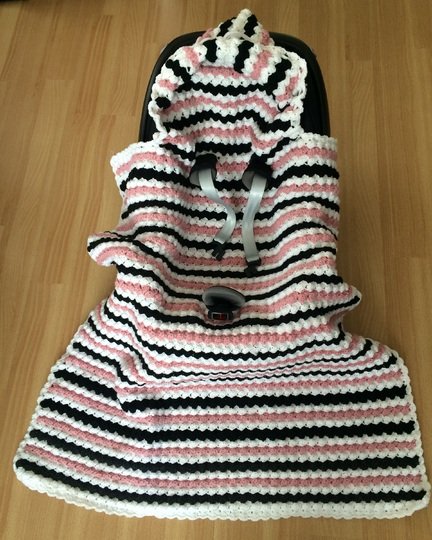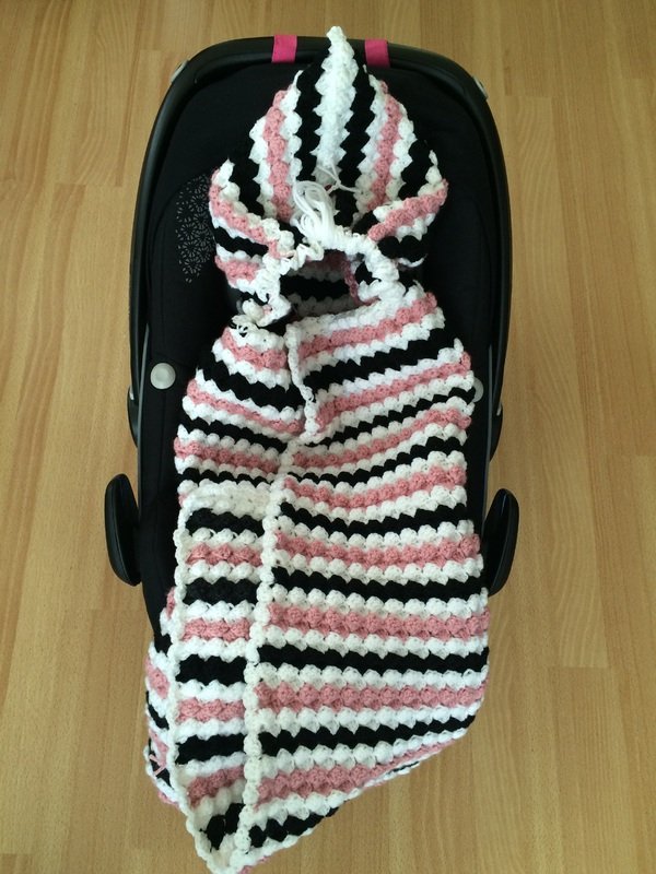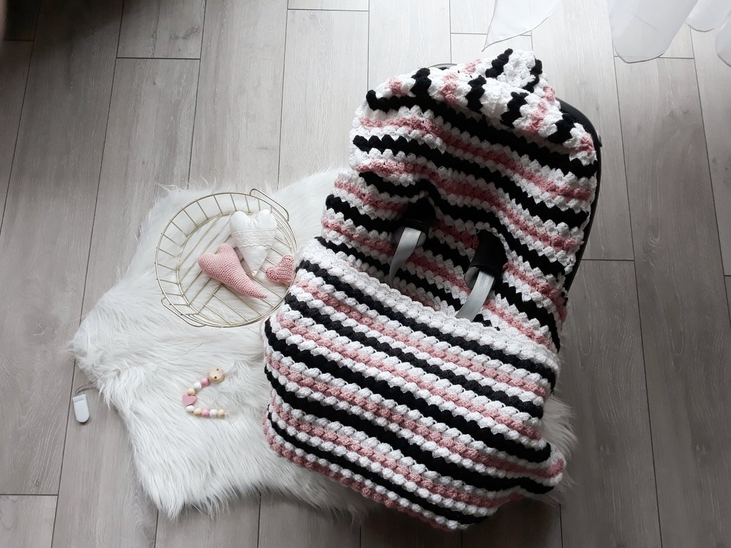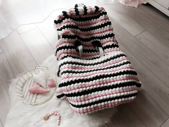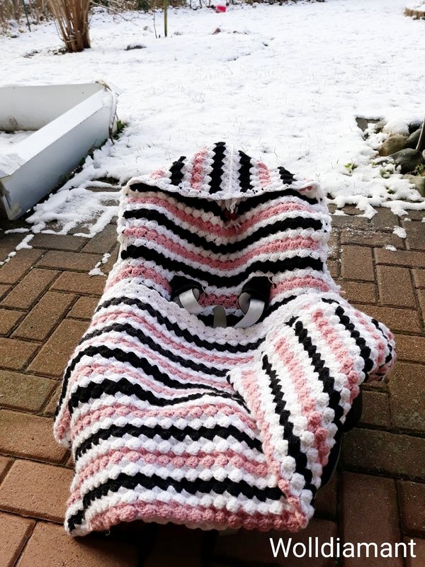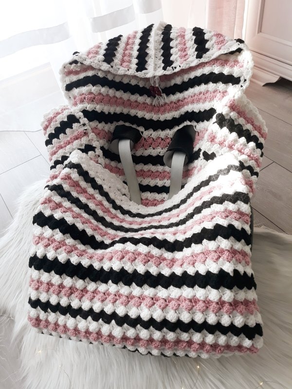 Die Einschlagdecke passt in eine Babyschale mit Dreipunktgurt sowie einem Kinderwagen, der diesen Gurt hat!
