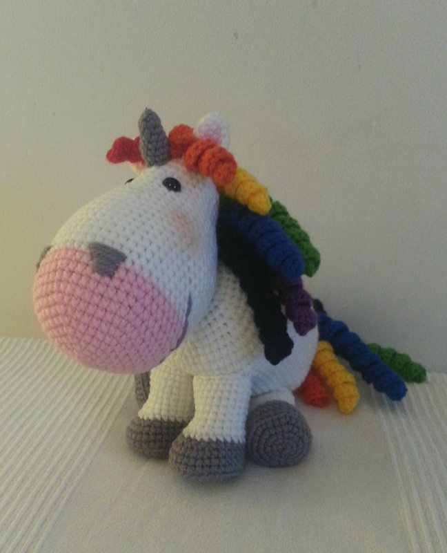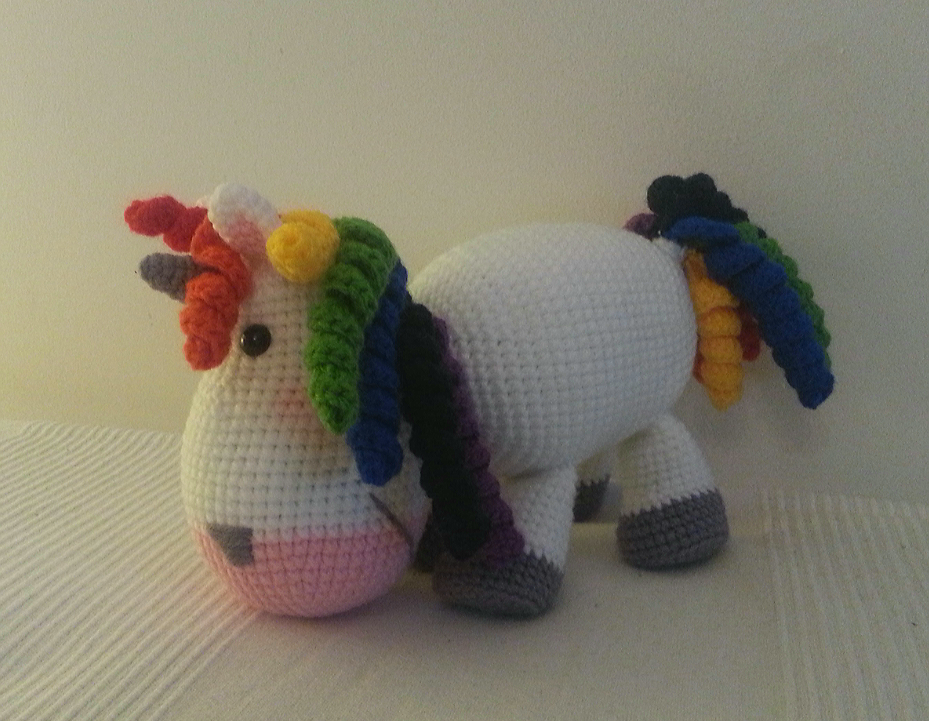 Von irgendwo hinter dem Regenbogen kommt ein entzückend knuffiges Einhorn mit Lockenmähne und -schweif daher. Mit einer Länge von 20 cm, einer Höhe von 16 cm und einem Stockmaß von 12 cm ist es für ein Amigurumi schon ziemlich XL.
