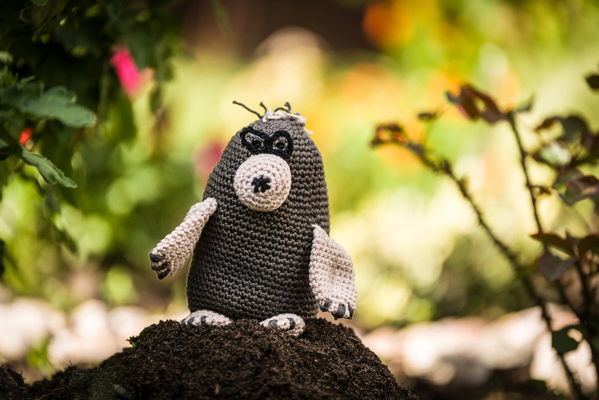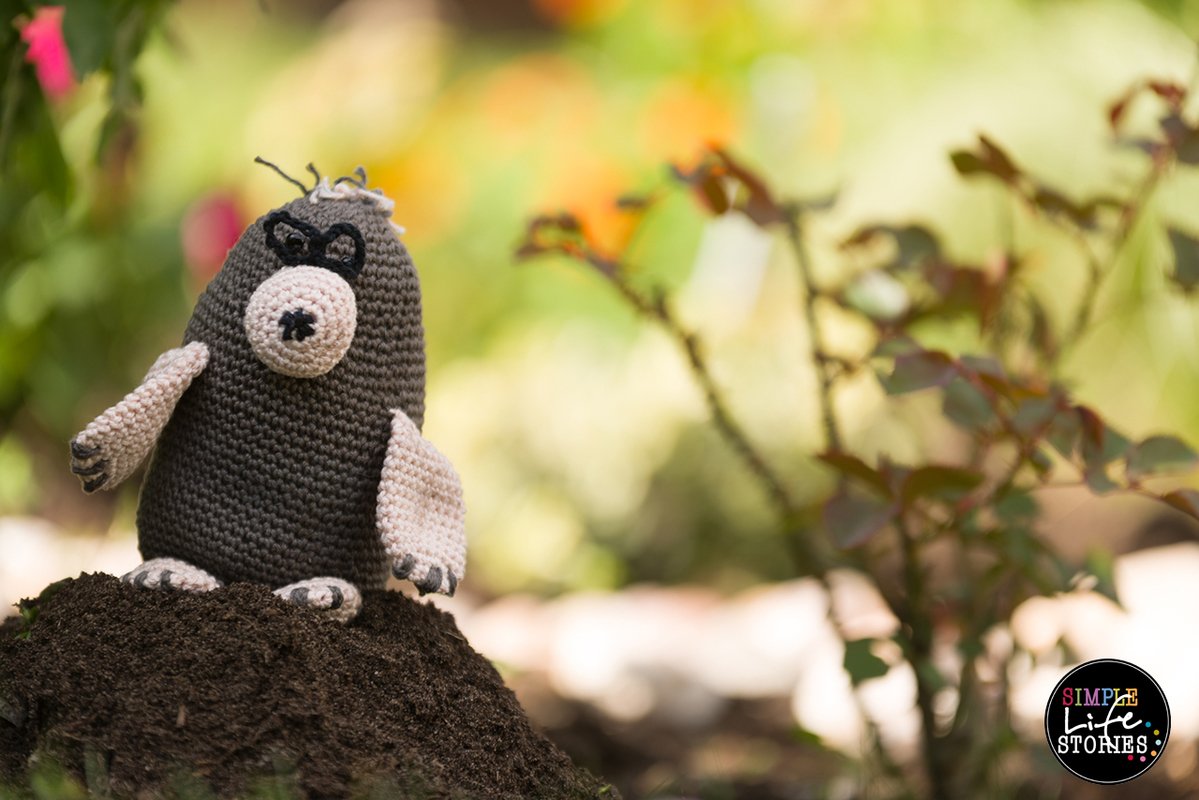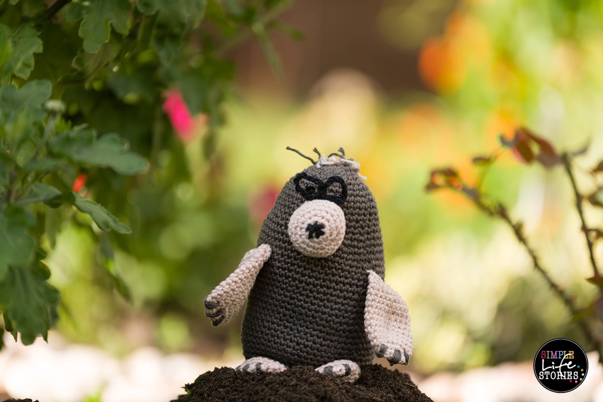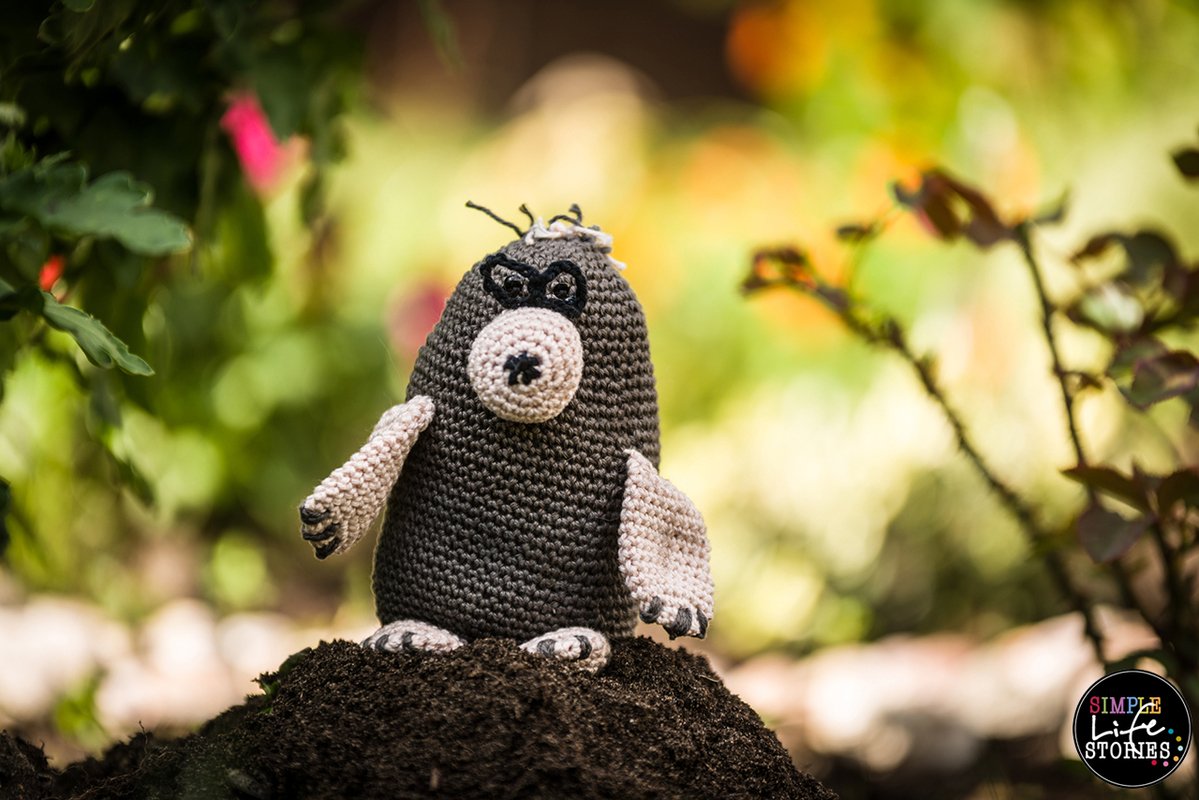 Moppel ist ein niedlicher Maulwurf, 15 cm hoch, der sich ganz schnell häkeln lässt. Er besteht aus Kopf & Körper, Beine, Arme und Nase. Natürlich darf man auch die Brille nicht vergessen. Die Brille kann man in rund oder auch in eckig anpassen, sieht richtig witzig aus.