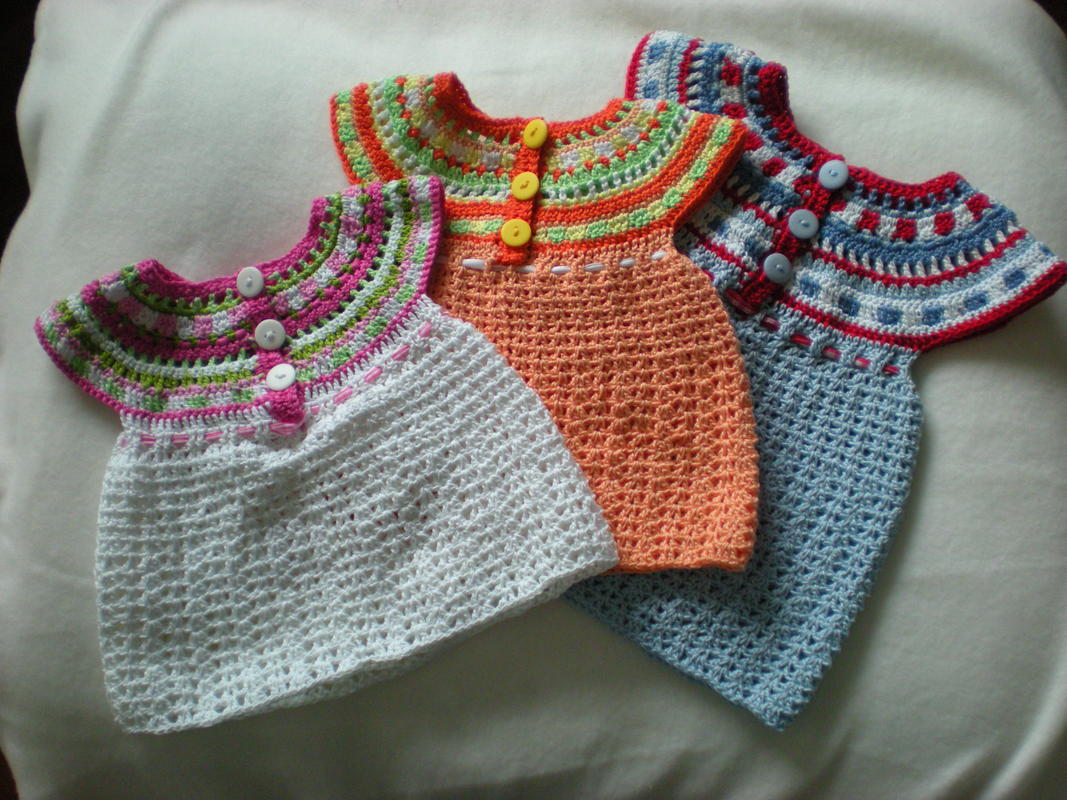 Dieses Kleidchen häkelst Du in Deinen Wunschfarben. Es sieht immer hübsch aus. An kühlen Tagen ein T-Shirt darunter.