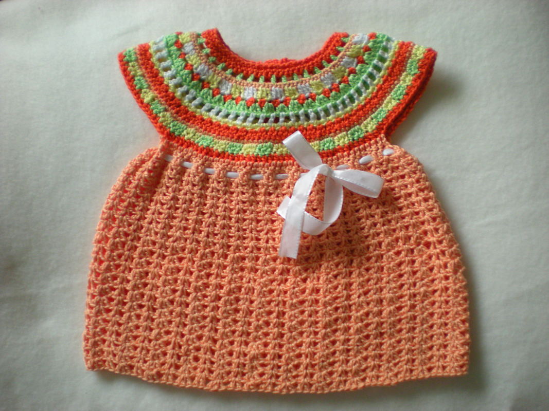 Gehäkelt ist das Kleidchen aus Baumwolle, Lauflänge 125 m je 50 g.