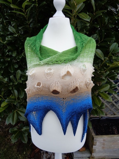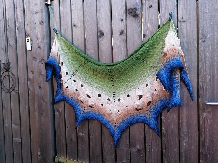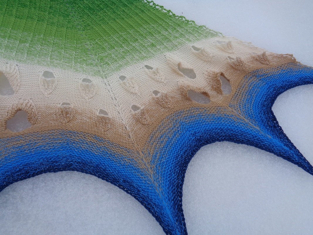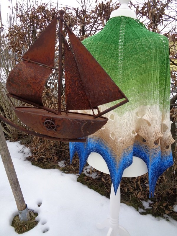 Grashügel, Sanddünen, jede Menge Muscheln und viel Wasser laden beim Stricken zum Träumen ein. Oh, ja! Ich habe das Tuch im Winter gestrickt und träumte, während es draußen stürmte und schneite, von Sandstränden und Liebespärchen, die Hand in Hand barfuß die Brandung entlangspazieren und dann und wann Muschelschalen sammeln. Hach, wie schön kann Stricken sein!
