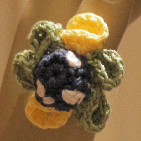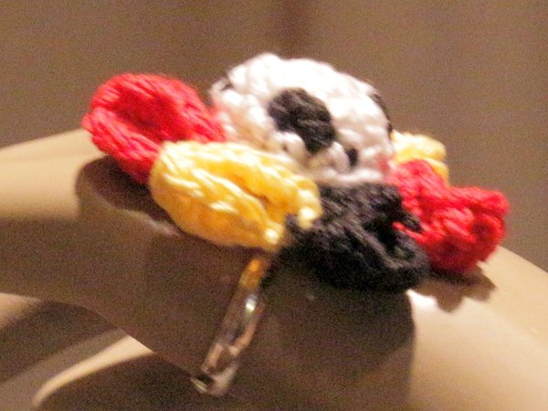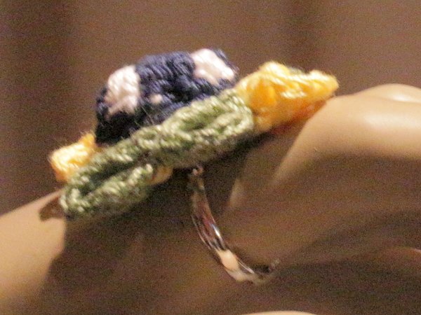 Eine Häkelnadel Stärke 1,75 bis 2,0 . Etwas Füllwatte (zur Not geht es auch mit Wollresten) und den einstellbaren Ring-Rohling "Sieb 20mm". (Wenn Du ihn nicht rechtzeitig hast, trägst Du ihn als Brosche oder nähst ihn einfach über irgendeinen Modeschmuck-Ring)