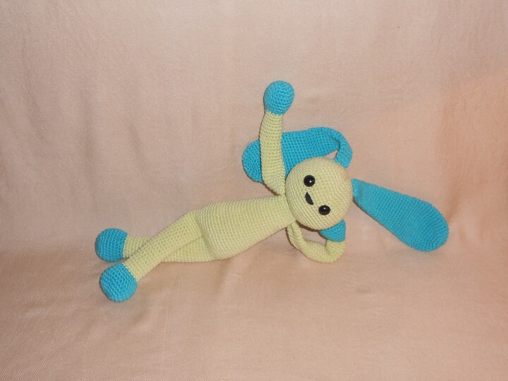 Ich bin der freche Hops zum schlenkern, kuscheln, lieb haben, knuddeln oder einfach im Arm zu halten wenn mein Menschenfreund schlafen möchte.