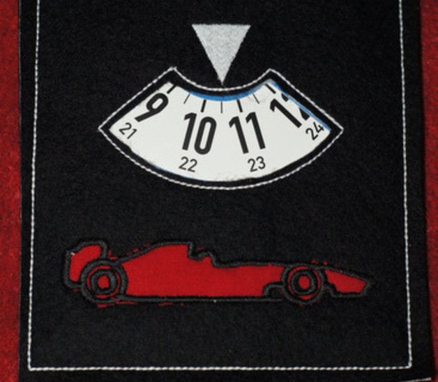 Die mit dieser Stickdatei gefertigten Parkscheibenhüllen sind ca. 16cm lang und 12cm breit. Für die Benutzung der Scheibe sollte man also diese aus der Hülle zu nehmen.