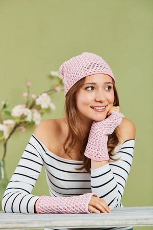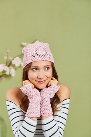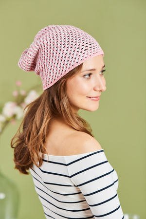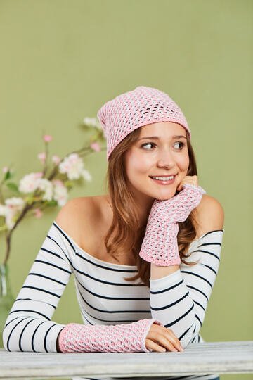 Material • L & K „Woolly Hugs NOBLY“ (74 % Baumwolle, 26 % Seide, Lauflänge ca. 130 m/50 g): für beide Teile insgesamt je 100 g Rosa und Zartflieder • Tunesische Häkelnadel Nr. 6