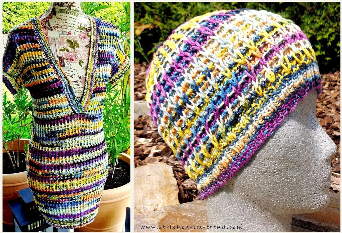 Baumwoll-Qualität + bunte Farben + raffiniertes Muster = Sommerpulli + dazu passende Mütze.
