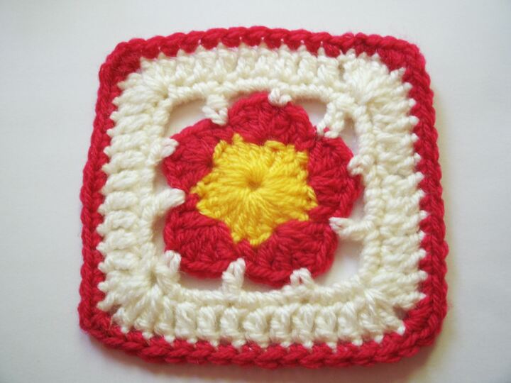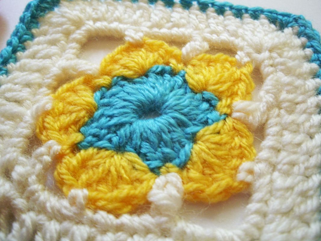 Häkelanleitung für einen etwas anderen Granny square, mit einer 5 blättrigen Blüte in der Mitte.