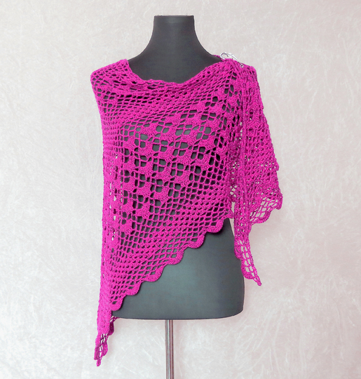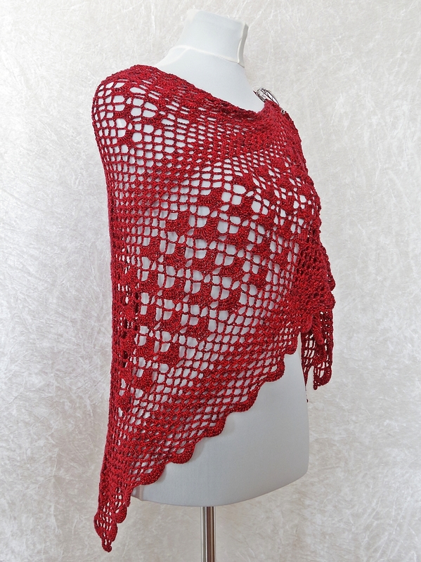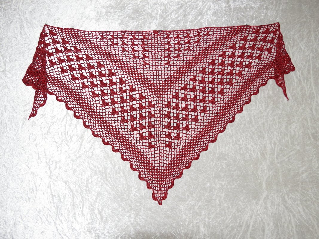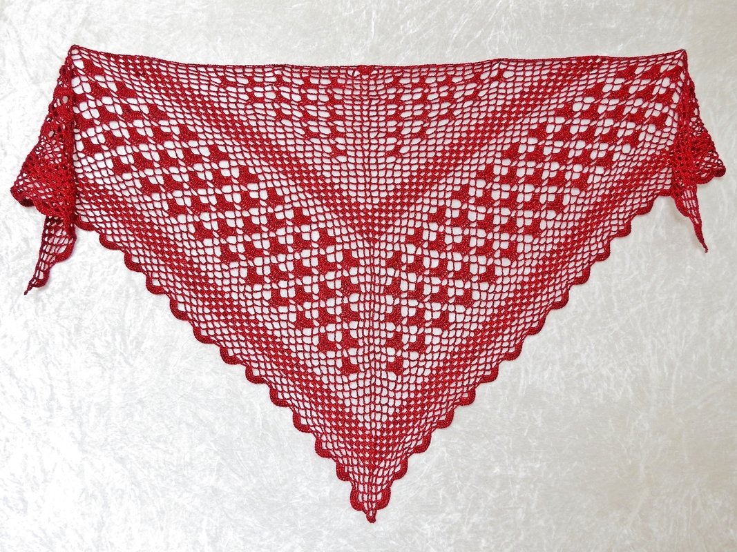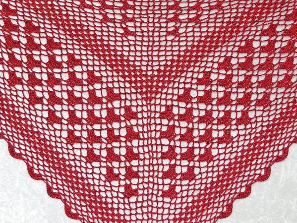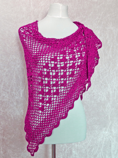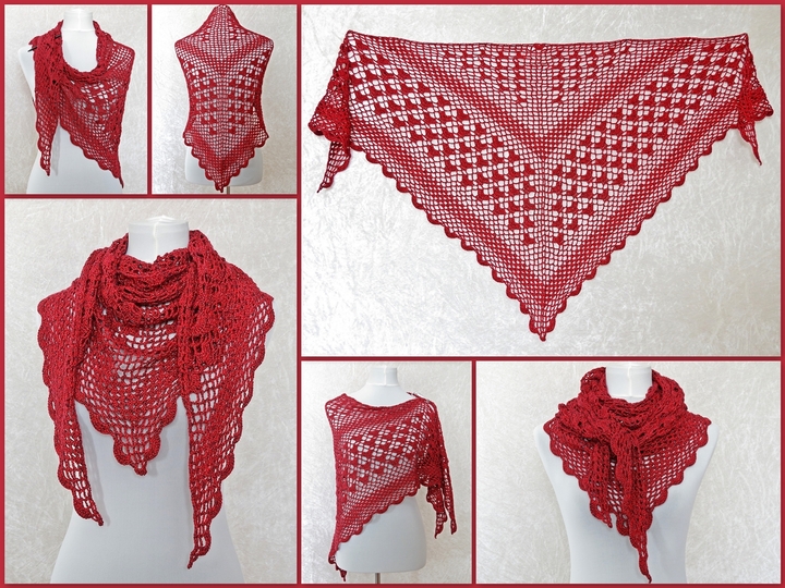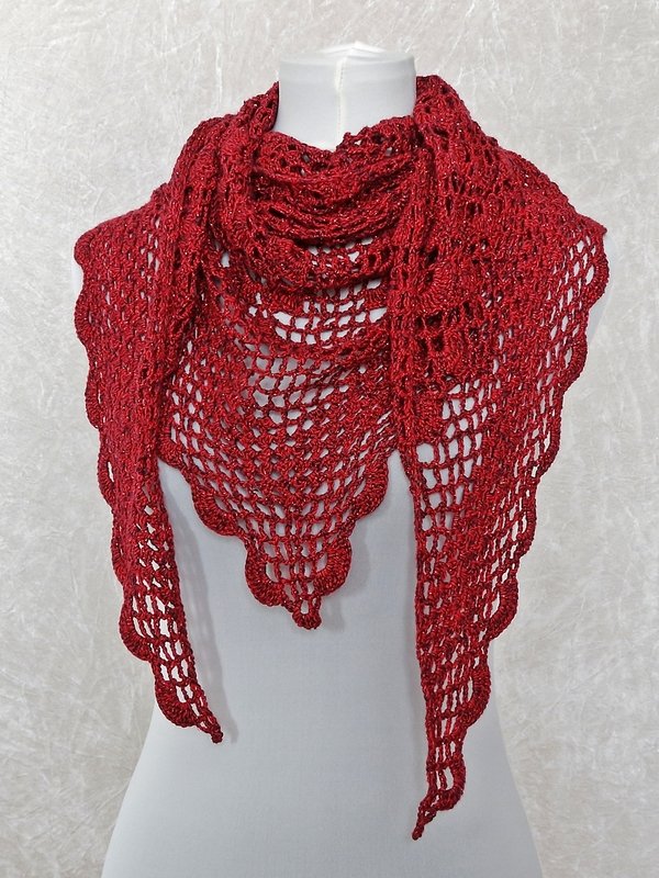 Das Tuch wird von oben nach unten gehäkelt und hat eine klassische dreieckige Form. Da das Muster nur aus festen Maschen, Luftmaschen und Stäbchen besteht, ist es wunderbar für Anfänger geeignet.