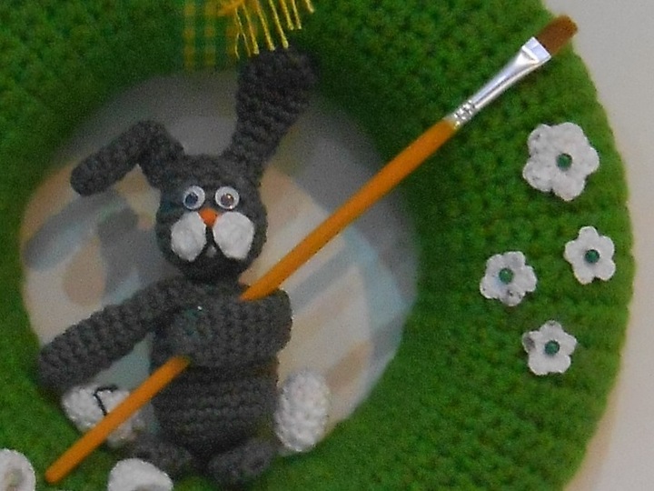 Also habe ich mich an mein neues Hobby gesetzt und mit Wolle und Nadel experimentiert. Dabei ist dieser Kranz zu Stande gekommen. Der kleine Hase hat viel zu tun, beim Eier anmalen geht ihm da leider auch mal was zu bruch.