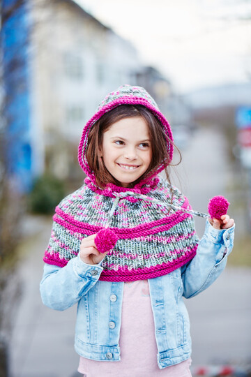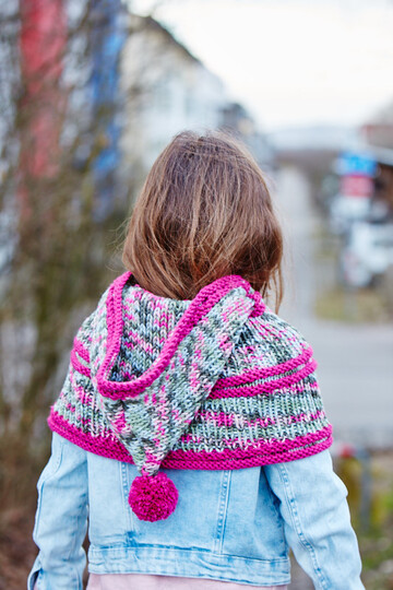 • L & K „hatnut fresh“ (50 % Schurwolle, 50 % Polyacryl, Lauflänge ca. 55 m/50 g): 250 g Grau-Pink • L & K „hatnut XL 55“ (50 % Schurwolle, 50 % Polyacryl, Lauflänge ca. 55 m/50 g): 100 g Pink • 1 Rundstricknadel Nr. 6,5 • 1 Häkelnadel Nr. 6