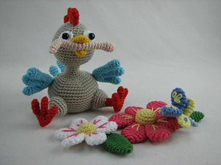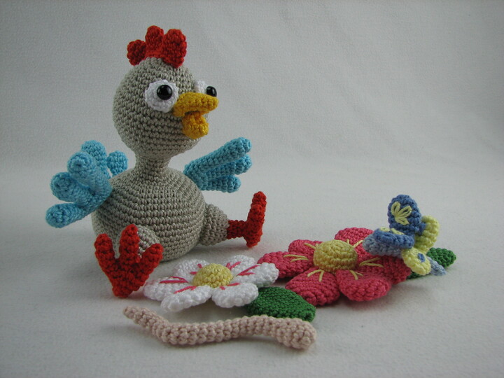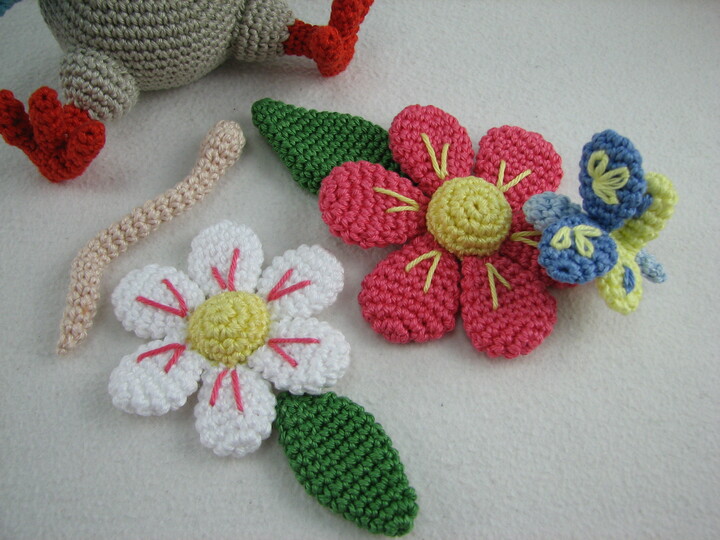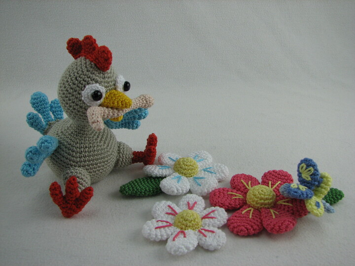Die Anleitung beinhaltet die Beschreibung des Kükens, Schmetterling, Würmchen, zwei Größen von Blüten und drei verschiedenen Blättern.