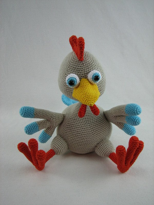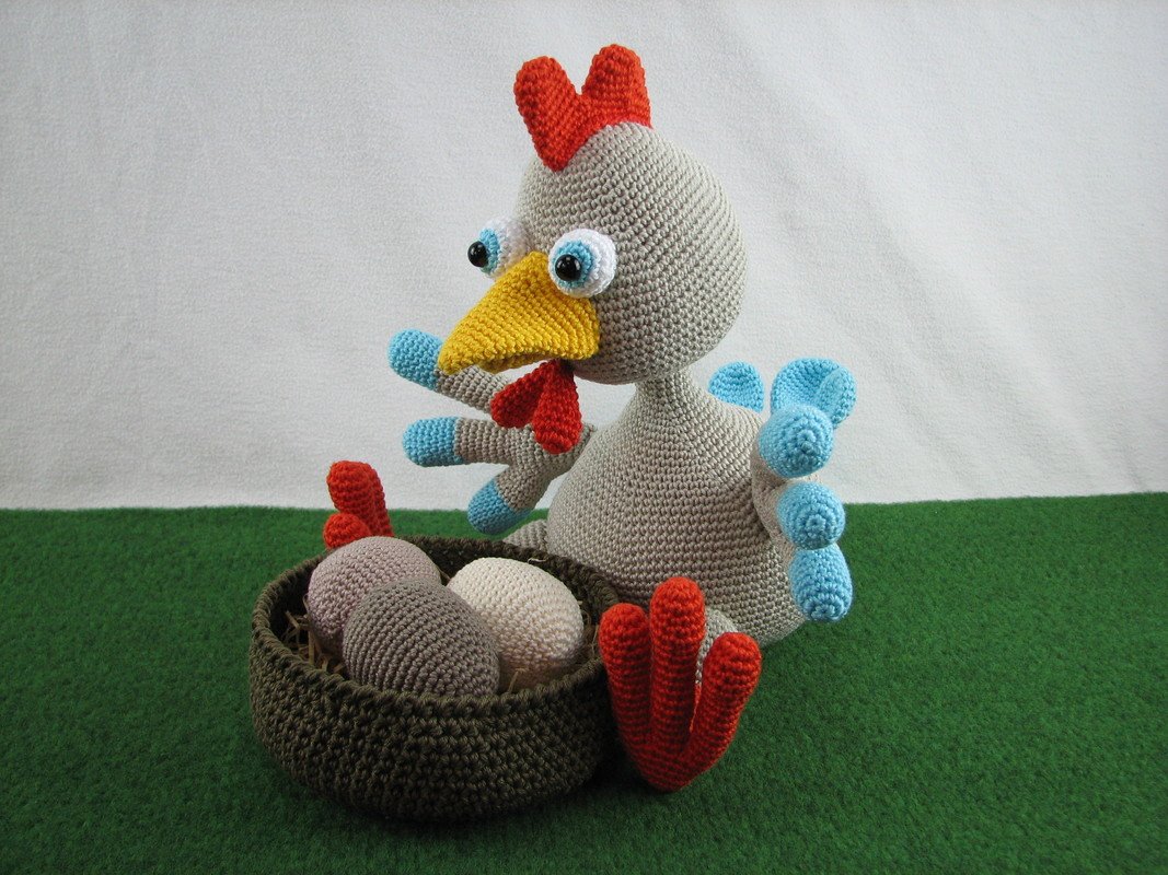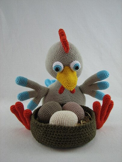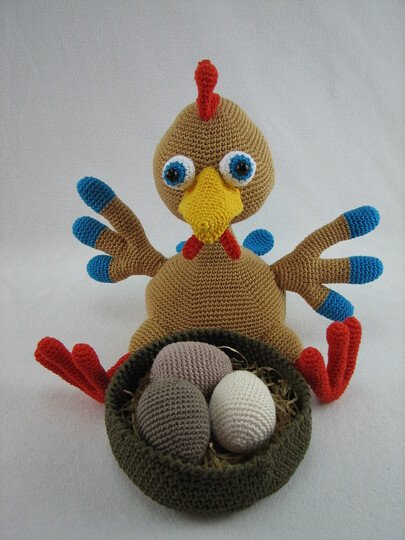 Die Anleitung beinhaltet die Beschreibung der Henne, des Körbchen und der Eier. Die Henne ist ca. 28 cm hoch. Der Durchmesser des Körbchen beträgt ca. 15 cm.