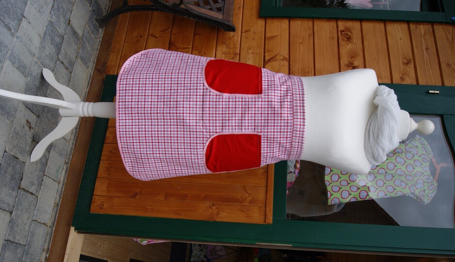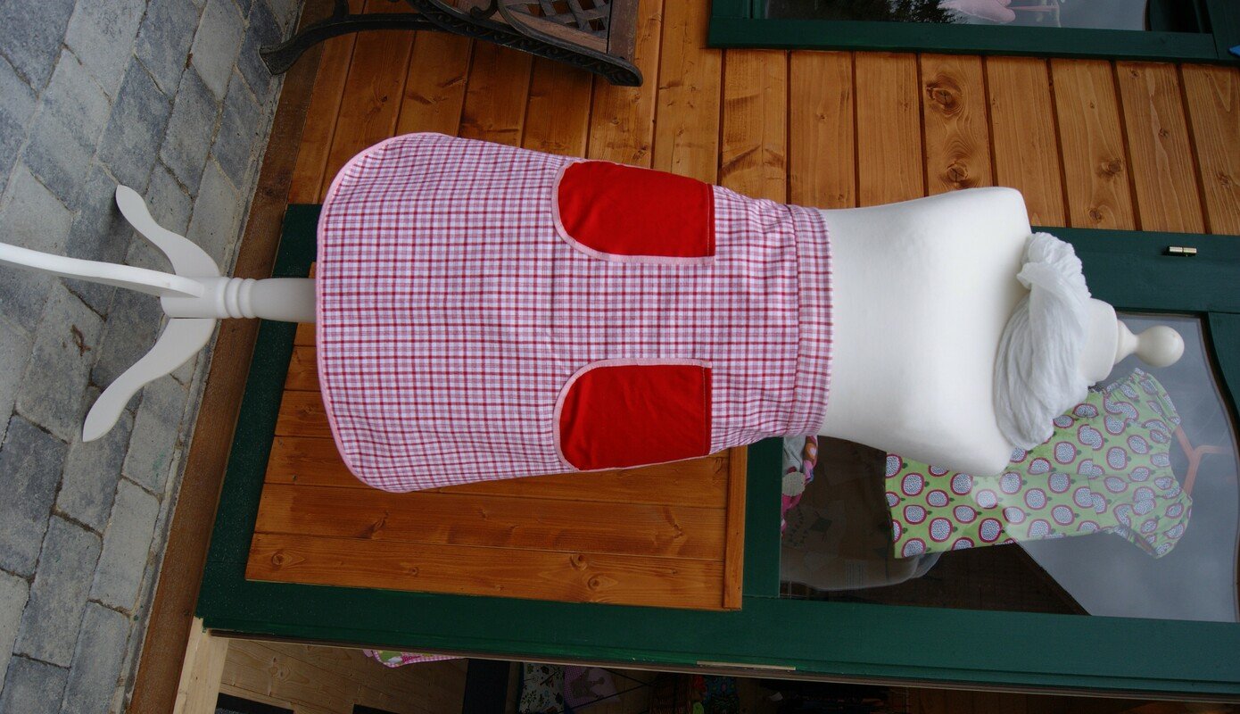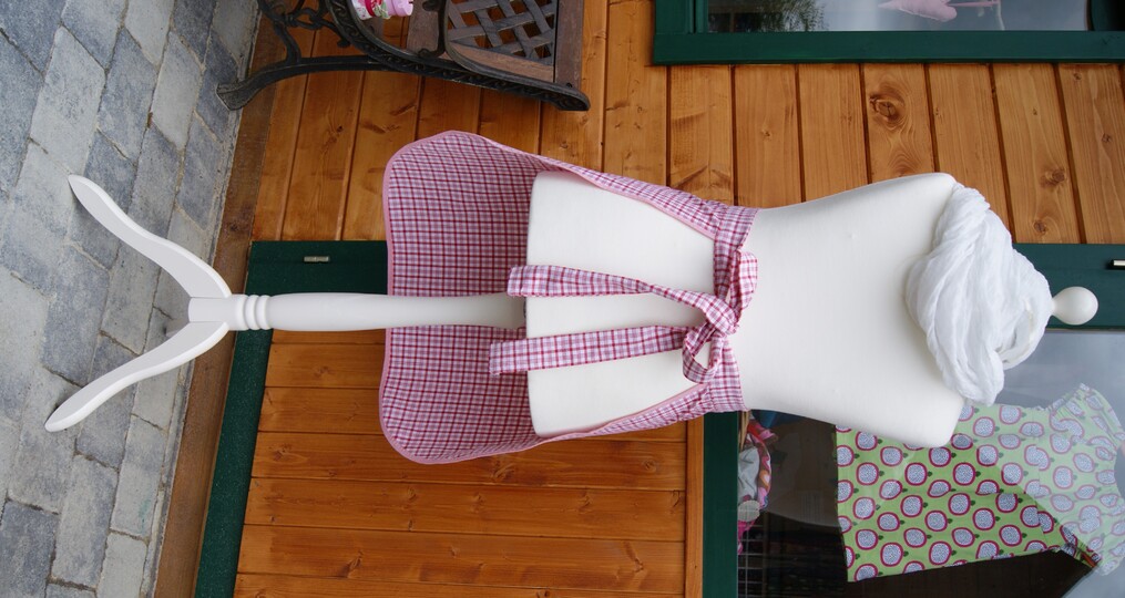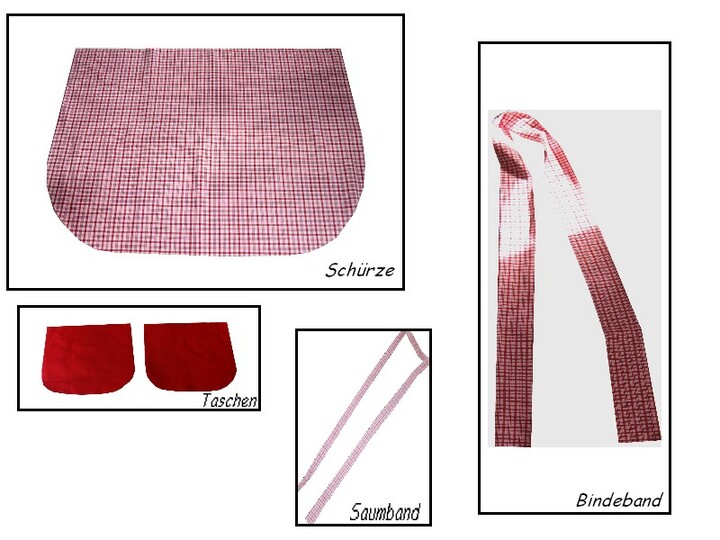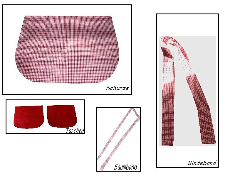 Die Schürze wird mit einem Bindeband genäht. Ist leicht ausgestellt mit rundem Saum geschnitten und geht knapp über das Knie.