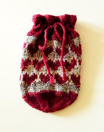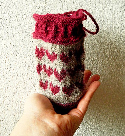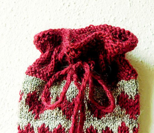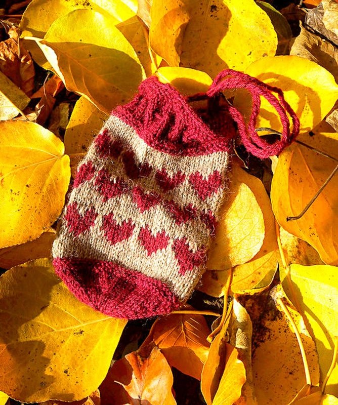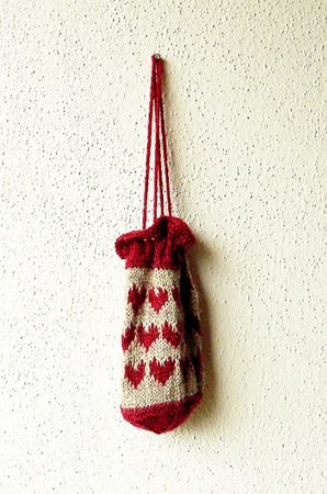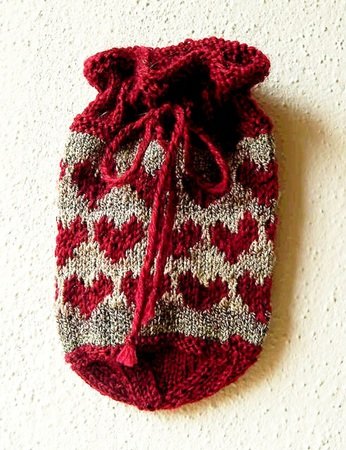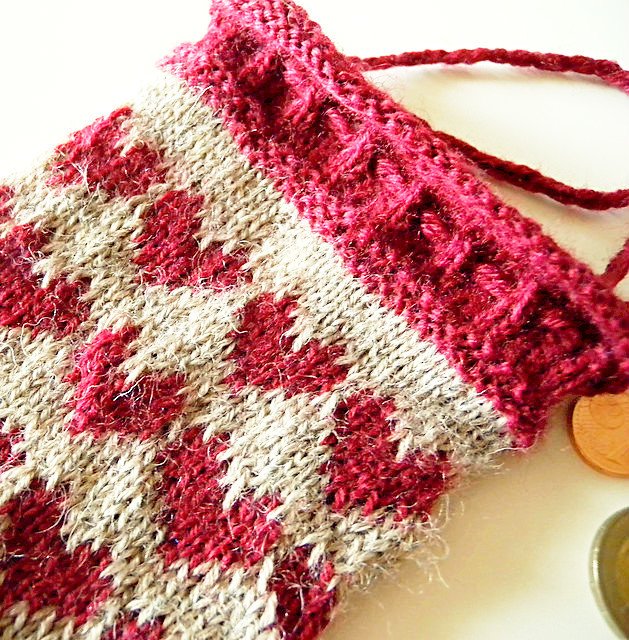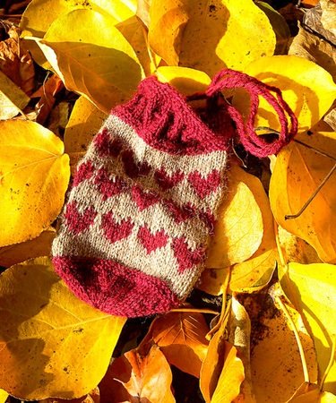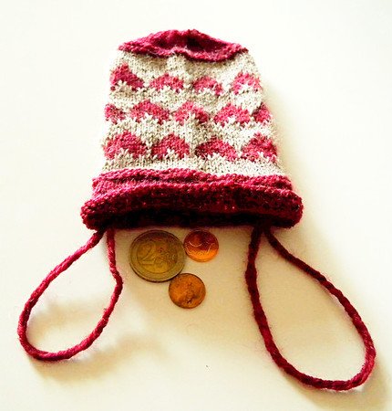 Diese Strickanleitung für einen kleinen Beutel mit Herzen heißt "Lucky Coin Bag". Es ist eine Anleitung, die gut geeignet ist, ein paar Sockenwollreste aufzubrauchen, in zweifarbigem Jacqardmuster einfach genug für Stricker/-innen, die schon ein bisschen Erfahrung mit der Technik haben. Für Strickanfänger würde ich sie allerdings nicht empfehlen.