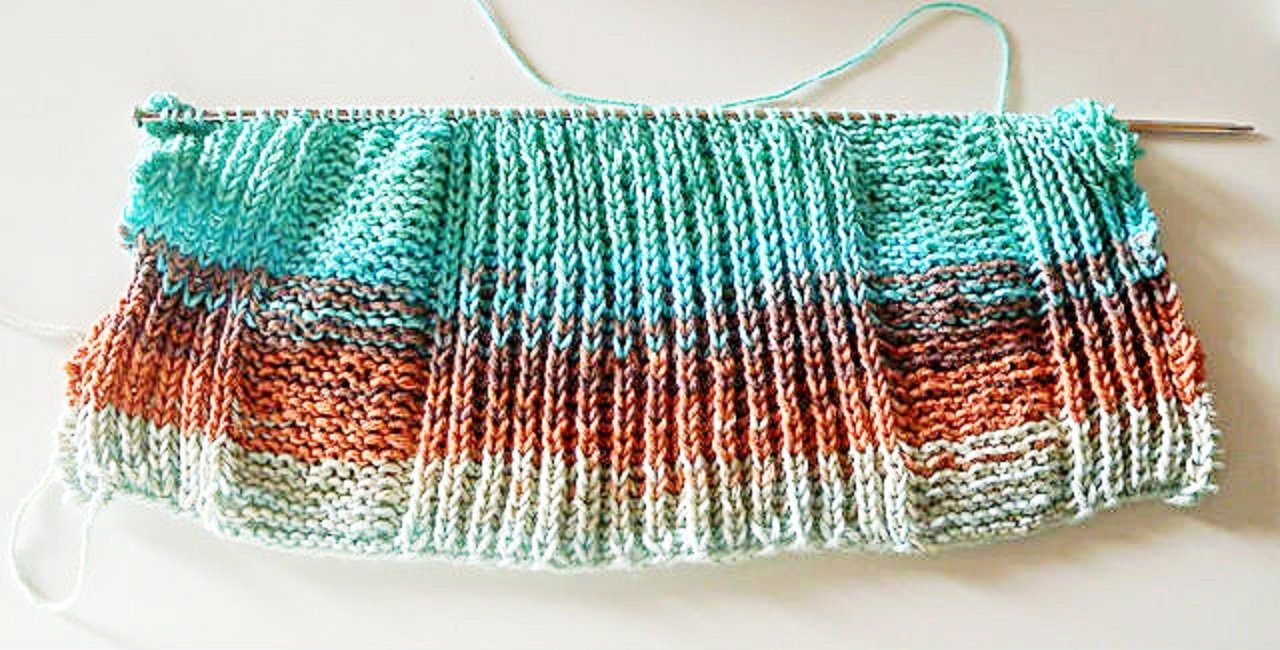 Das abgebildete Tuch wurde aus Alize Cotton Gold Batik gestrickt, ein eher dünnes Baumwoll/Polyacryl-Mischgarn, das vor allem für seine wunderschönen Farbverläufe bekannt ist. Jedes Verlaufsgarn mit langen Farbwechseln wird sich in dem Muster gut machen. Wer ein wärmeres Tuch bevorzugt, sollte zu etwas Wolligem greifen. Natürlich kann man auch einfarbige Garne verwenden.