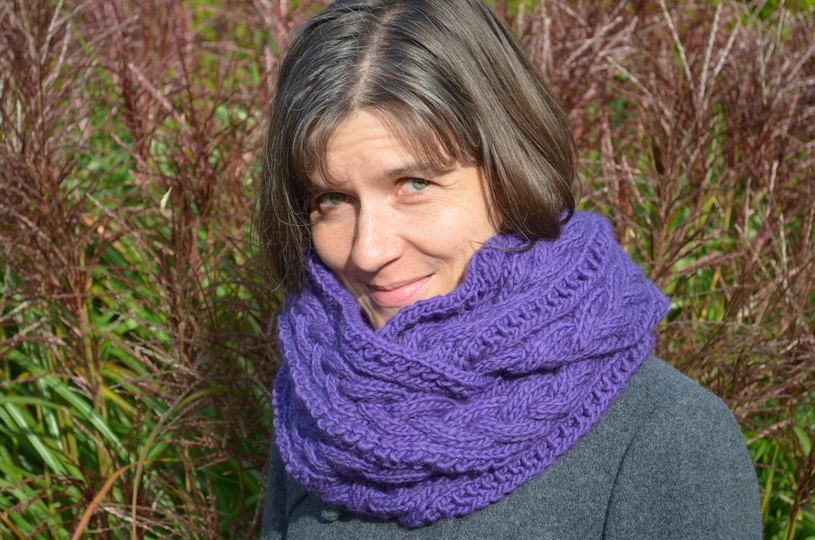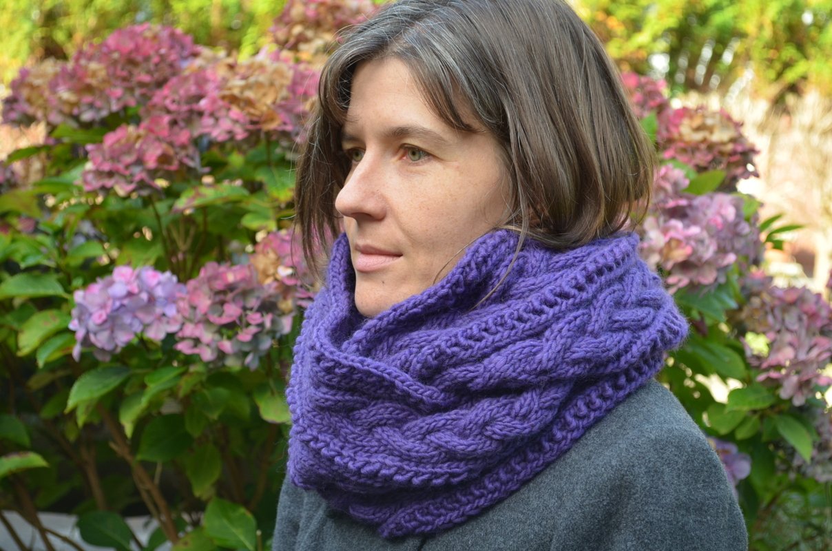 Material für den Loop: ca. 250 g Wolle (100% Schurwolle oder andere Qualität in ähnlicher Stärke) in lila oder Lieblingsfarbe (Lauflänge 85 m/50 g). Stricknadeln Nr. 6, Hilfs- oder Zopfnadel.