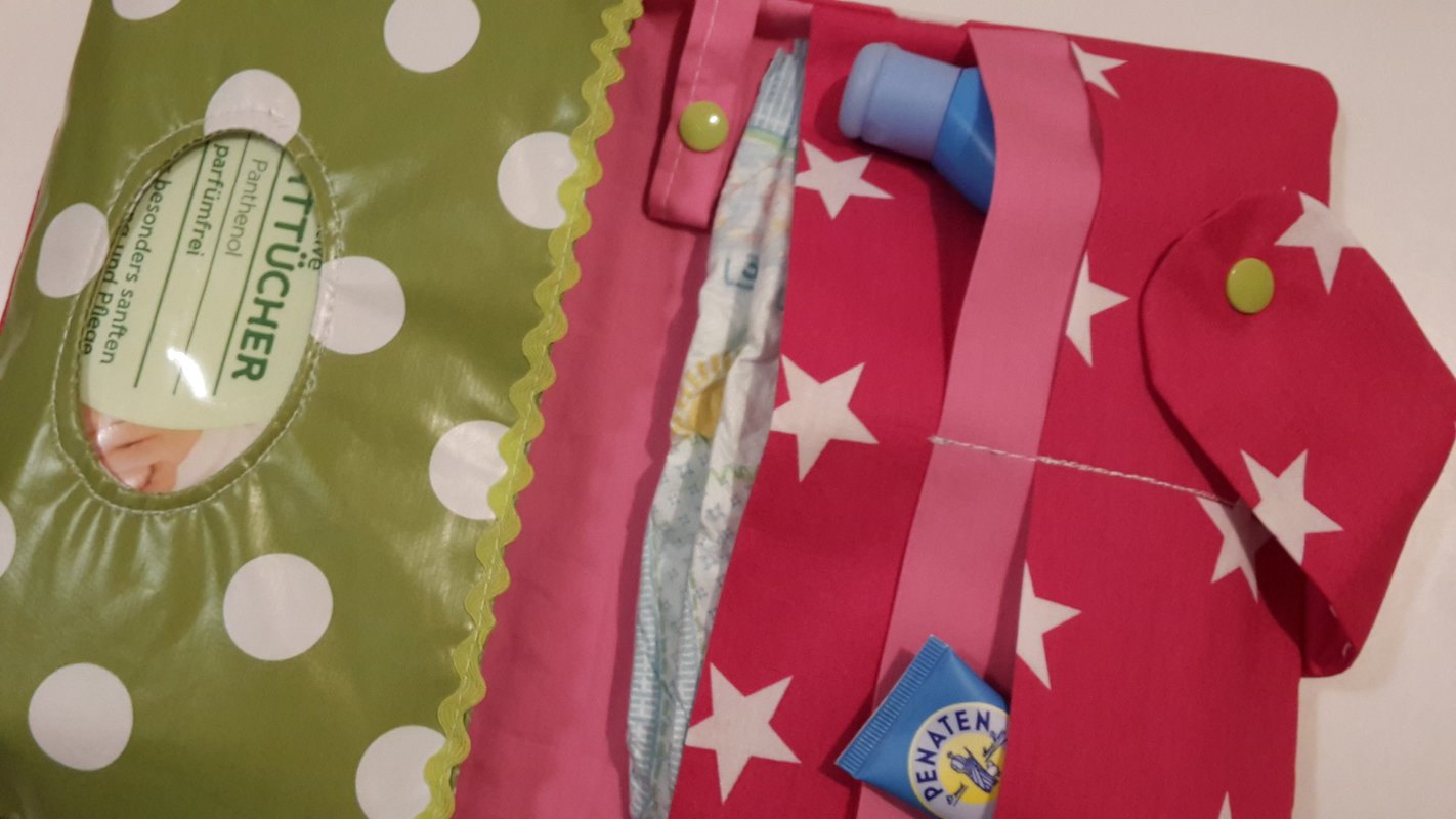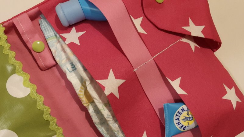 Die Tasche ist groß genug für 4-5 Windeln, Feuchttücher und noch viele weitere Kleine Dinge. Größe offen: 32cm x 25cm Größe geschlossen: 16cm x 25cm