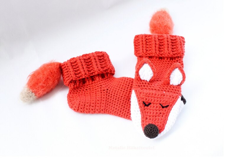 Die umfangreiche, reichlich bebilderte PDF-Häkelanleitung zum Häkeln von Haussocken in der Form eines Fuchses, Größen 34-43. Mit diesen Haussocken frieren Ihre Füße nie! Auch schön als kleines Geschenk für Freunde und Verwandte.