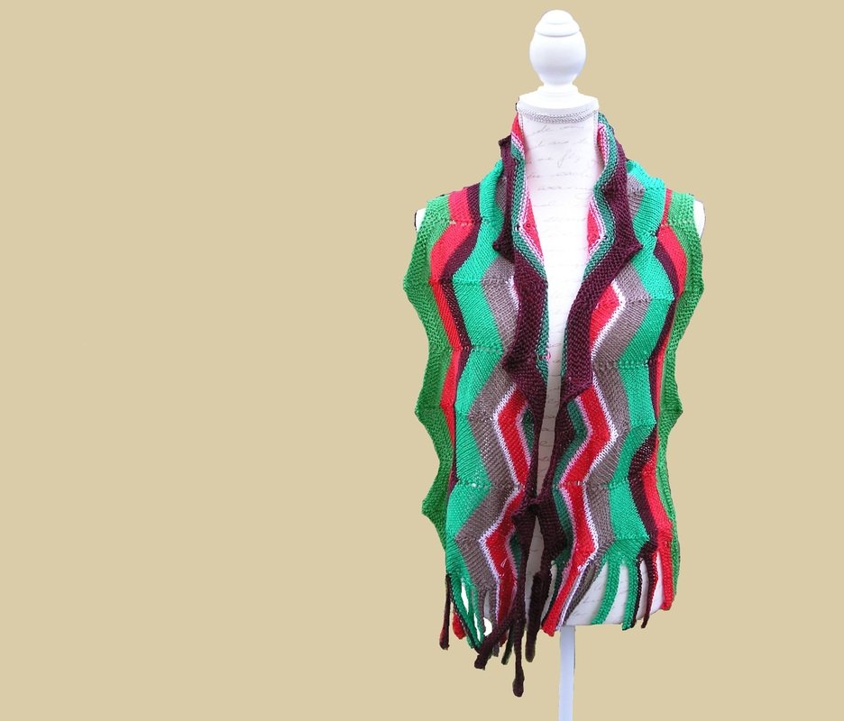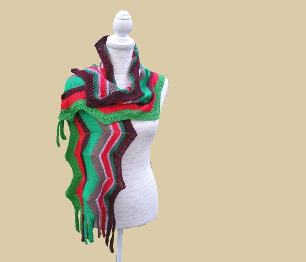 Dieser Schal wird mit einem Zick-Zackmuster gestrickt, was wirklich sehr einfach ist. Die Fransen werden gleich mit angestrickt. Man muss immer ein paar Reihen stricken, für die Fransen Maschen abketten und in der nächsten Reihe die gleiche Anzahl Maschen neu anschlagen. Auch das geht einfach. Trotzdem erhält man einen ausdrucksstarken Schal, den auch Strickanfänger problemlos hin bekommen. Die Anleitung eignet sich sehr gut, um Wollreste zu verarbeiten.
