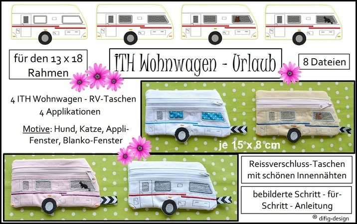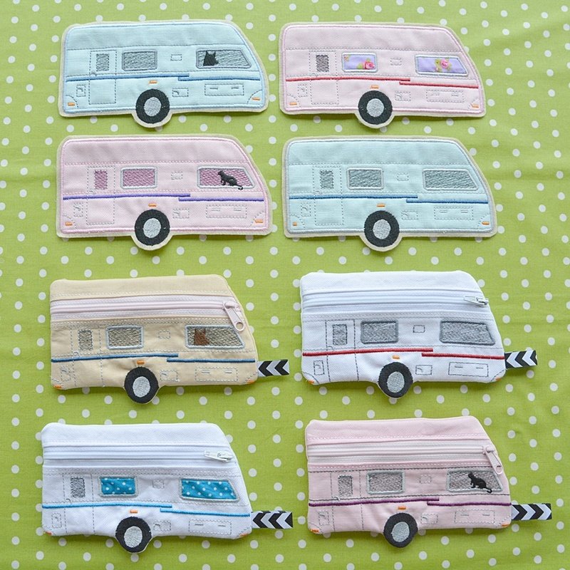 Geliefert werden 4 ITH - Taschen in Form von Wohnwagen und 4 Applikationen - Stickdateien. Meine Stickdateien können Sie nach Bezahlung in den Formaten pes, hus, jef, vip, vp3, dst und exp bei Fetchit downloaden. Brauchen Sie andere Formate bitte VOR dem Kauf bei mir anfragen.