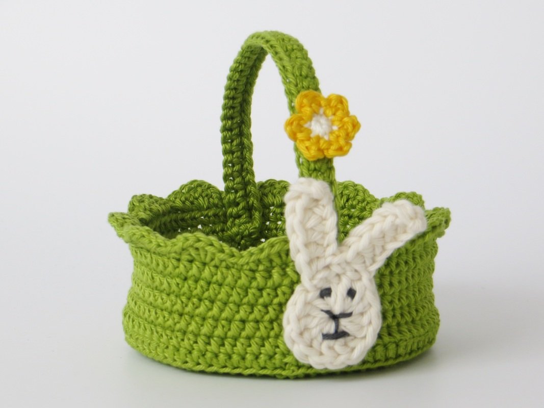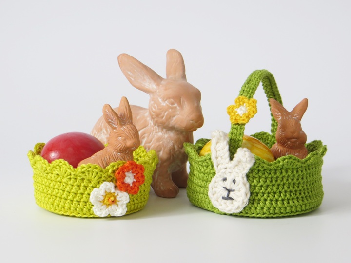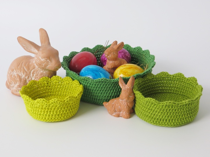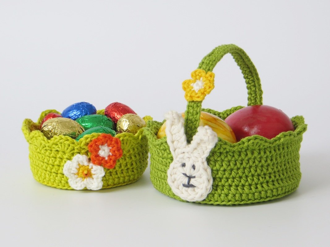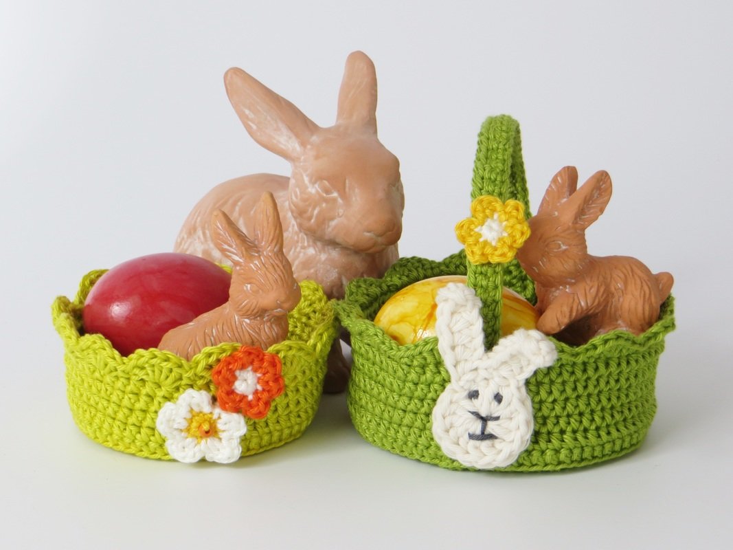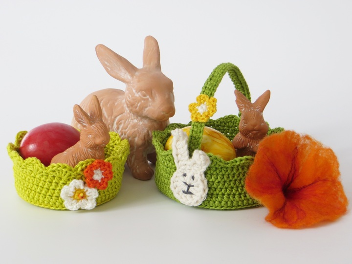 Die Körbchen können in jeder beliebigen Größe gehäkelt werden. Je nach Größe können sie sehr vielseitig für allerlei Krimskram oder auch, evtl. verziert mit Blümchen oder Häschenkopf, sehr schön als Osternest verwendet werden.