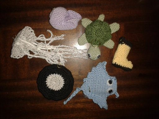 Die Qualle, der Rochen, die Spiralmuschel, der Reifen, die Schildkröte und der Gummistiefel sind mit verschluckbaren Kleinteilen (Wackelaugen und Metallringe) versehen, daher für Kleinkinder ungeeignet!