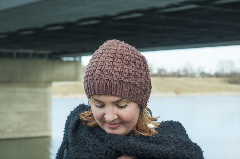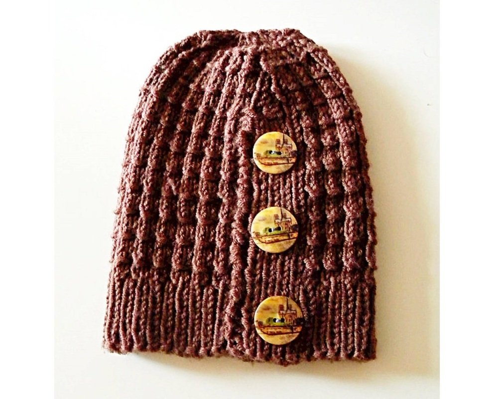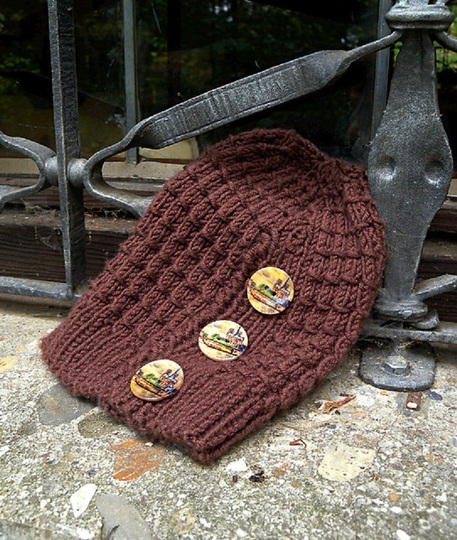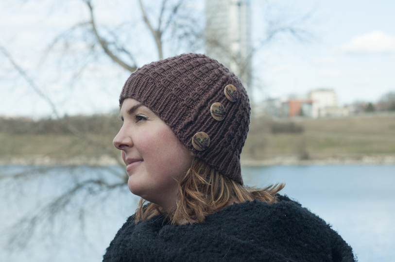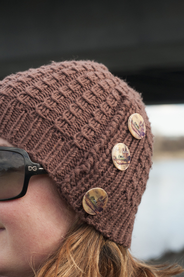 Die Mütze wird von unten nach oben in Bambusmuster gearbeitet. Sie beginnt in Reihen und wird später zur Runde geschlossen. Die Knöpfe dienen nur dekorativen Zwecken.