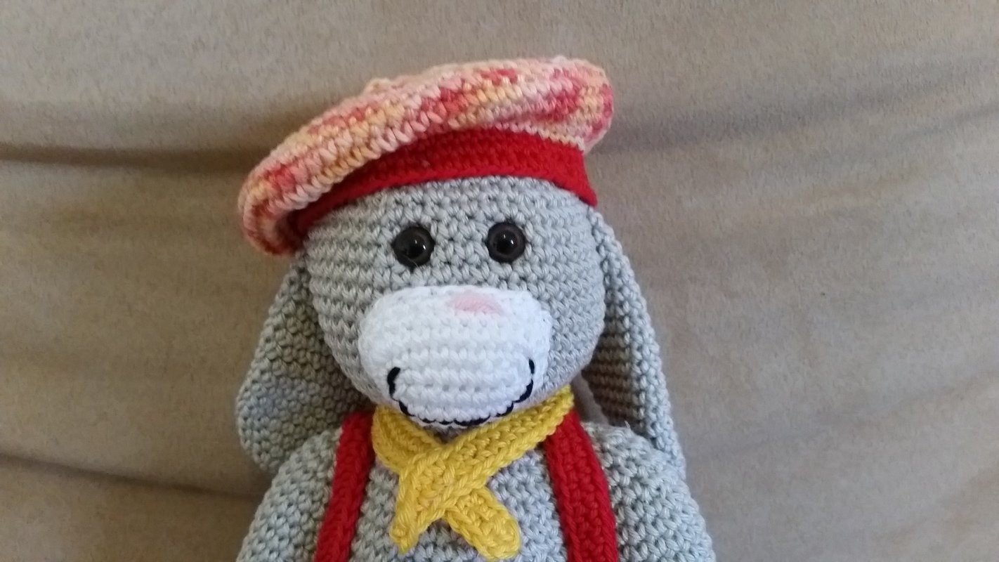 Heinrich Hase wird, unter Verwendung des angegebenen Materials, sitzend 20 cm groß. Ich persönlich empfehle für das Nacharbeiten all meiner Amigurumis Baumwollgarn.