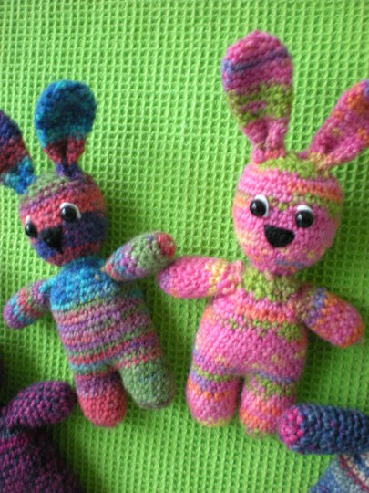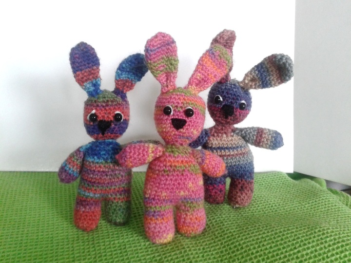 Wer kennt das nicht? Man hat so viele kleine Wollreste - Sockenwollreste und keine Idee, was man daraus zaubern kann? Dann sind diese kleinen Hasen eine tolle Idee.