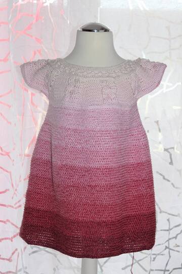 Dieses Kleid ist perfekt für die Übergangszeit von Frühling zu Sommer oder Sommer zu Herbst, da es zwar locker leicht fällt, aber keine Lochmuster verwendet wurden. Die Zopfmuster in der Rundpasse sind zudem ein schicker Eyecatcher.