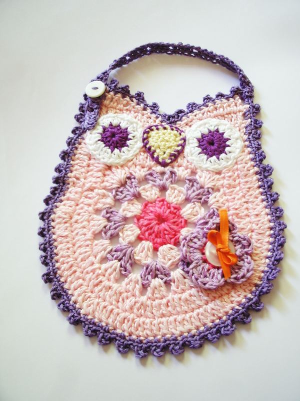 Ausführliche Häkelanleitung für süße Eulen-Lätzchen. Mit vielen Bildern die jeden Arbeitsschritt genau erklären.