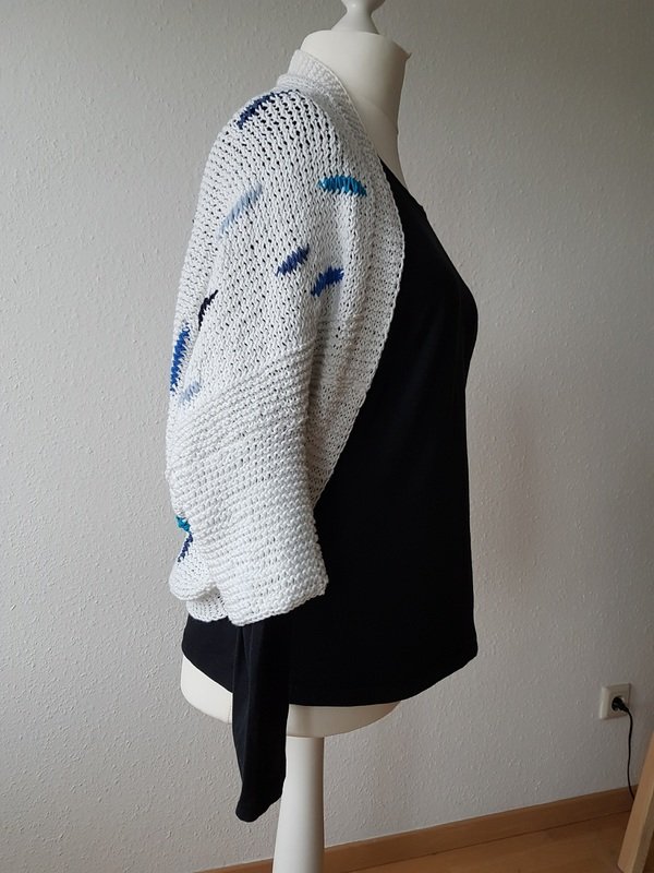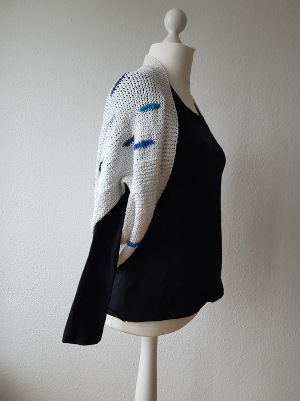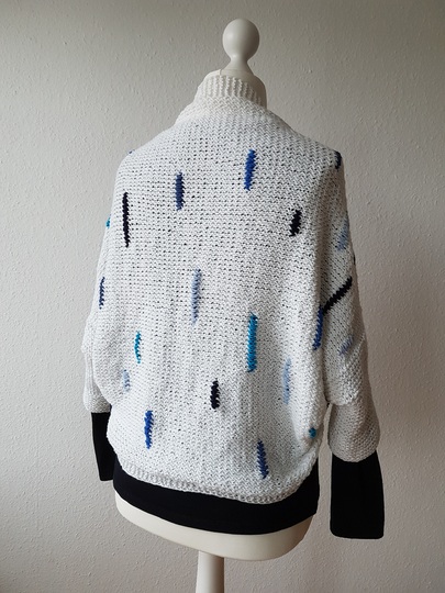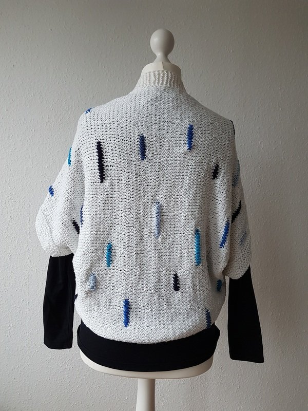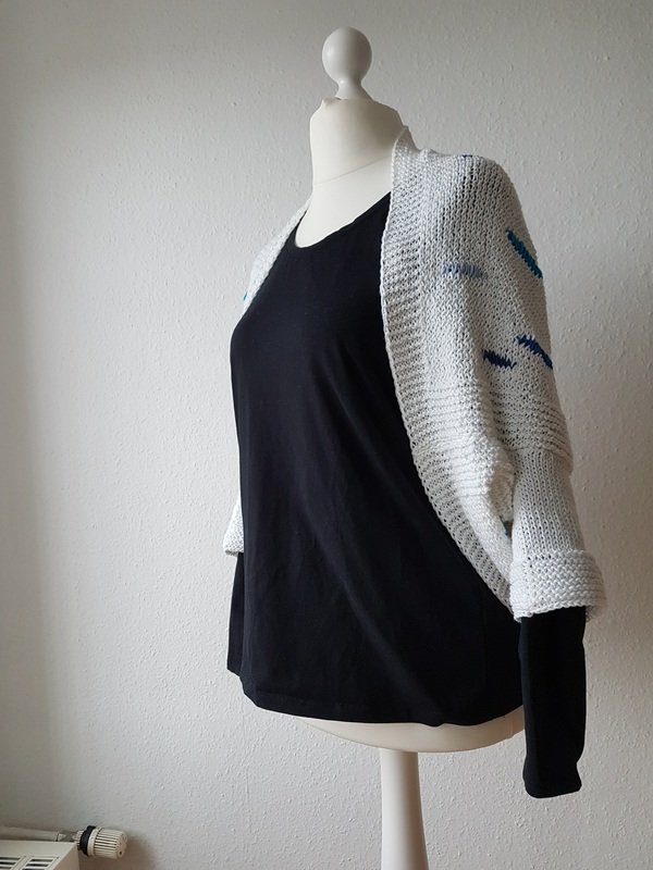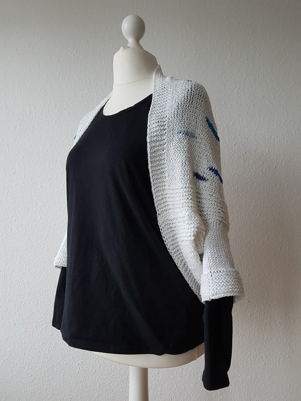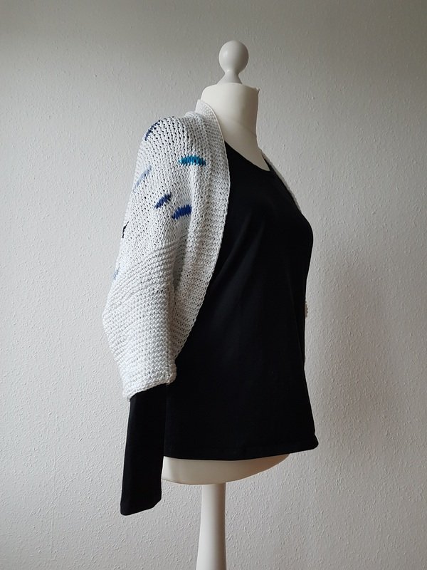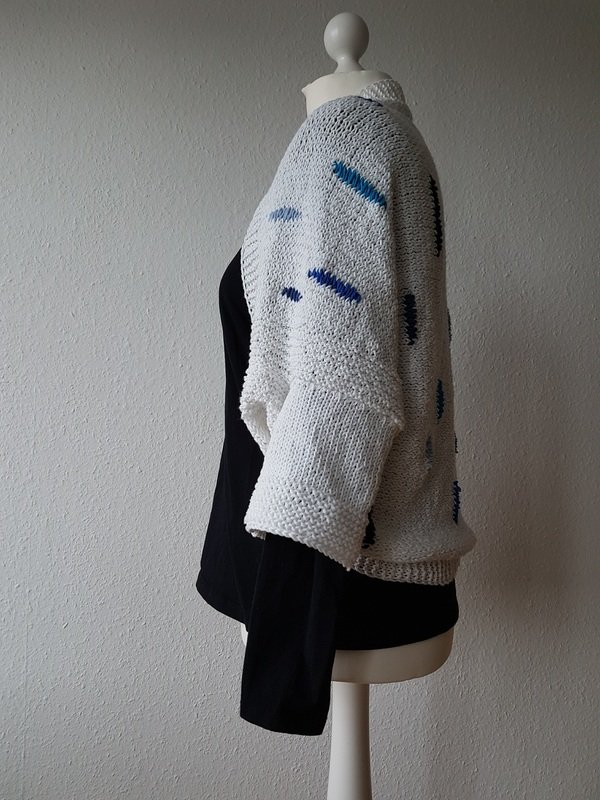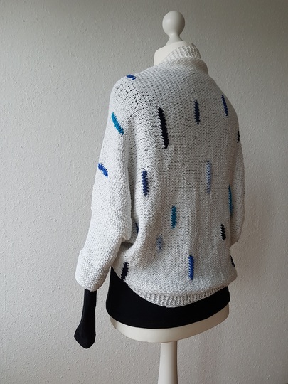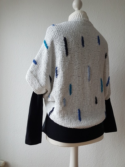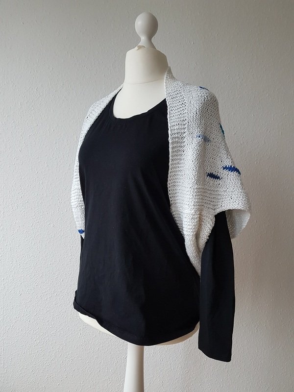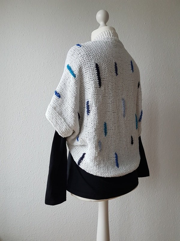 Diese Anleitung ist für einen Seelenwärmer mit Farbtupfern, die als Fallmaschen gearbeitet werden. Der Seelenwärmer ist schön leicht (nur 250 g), aber sehr kuschelig. Man kann ihn ohne Ärmel tragen, oder optional Ärmel anfügen.