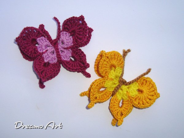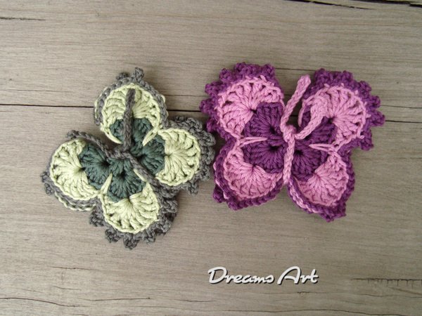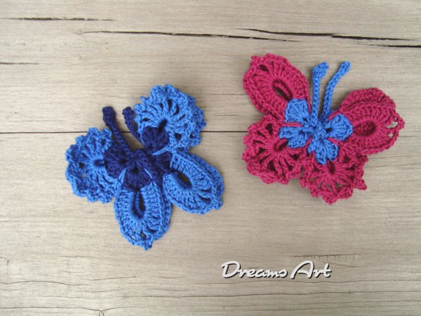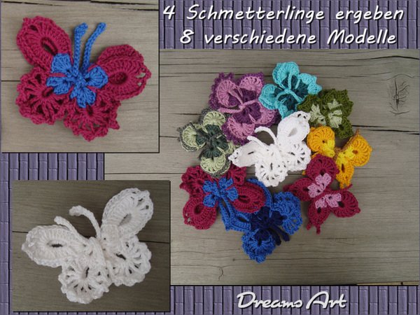 Hier bekommst du in elektronischer Form eine Häkel Anleitung für 4 Schmetterlinge. Durch die asymmetrische Flügelform ergeben sich dadurch insgesamt 8 unterschiedliche Schmetterlingstypen. Ich bevorzuge Baumwollgarne, man kann jedoch auch andere Garne dafür nutzen.