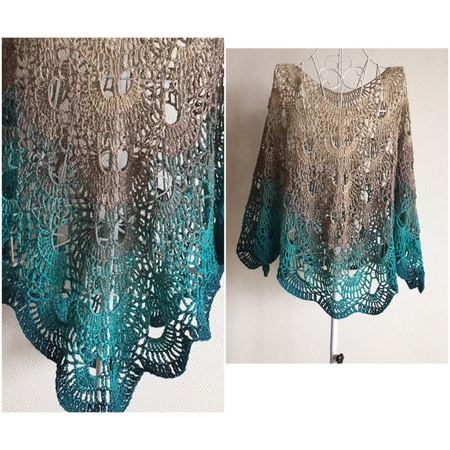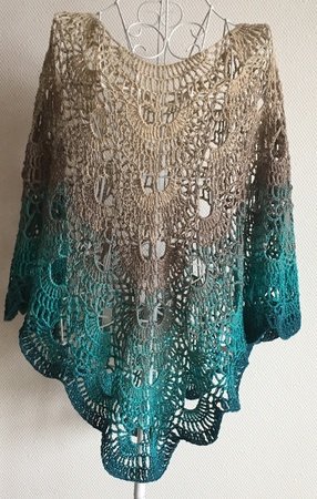 Länge: zwischen 55 und 75 cm (wer den Poncho länger möchte benötigt/möchte, kann einen zweiten BOBBEL entsprechend dem Farbverlauf von außen nach innen bzw. umgekehrt anhäkeln)