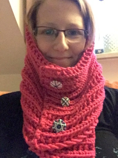 Toller Scoodie für kühlere Tage, der sich auch wunderbar über die Ohren ziehen lässt ;-) Benutzt wurden 200g Montego von Online (100m / 100g), 8,0mm Stricknadeln, ein paar dekorative Knöpfe, eine Nähnadel und wie immer ein kleiner Vorrat gute Schokolade ;-) Auch für Anfänger mit Strick- Grundkenntnissen geeignet.