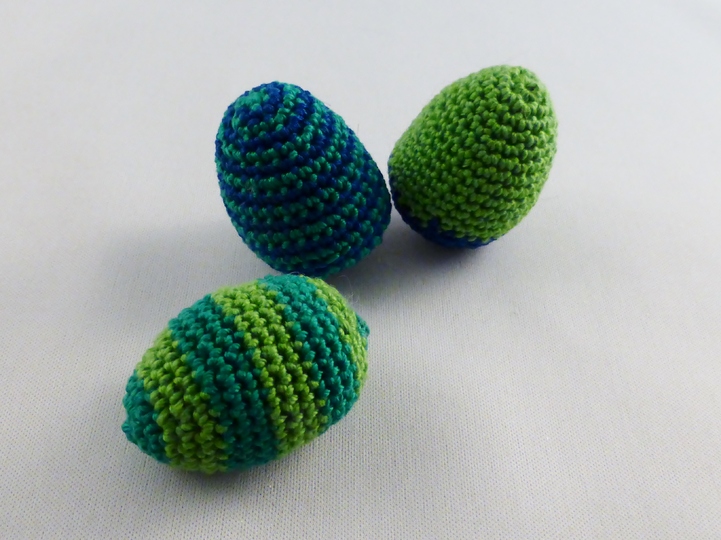 Mit einer 2,0 Häkelnadel (wie in der Anleitung) werden die Eierwärmer ca. 11 cm hoch. Der Durchmesser liegt bei 5 cm und passt daher perfekt über das Osterei. Die Eier sind 4 cm hoch.