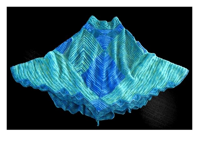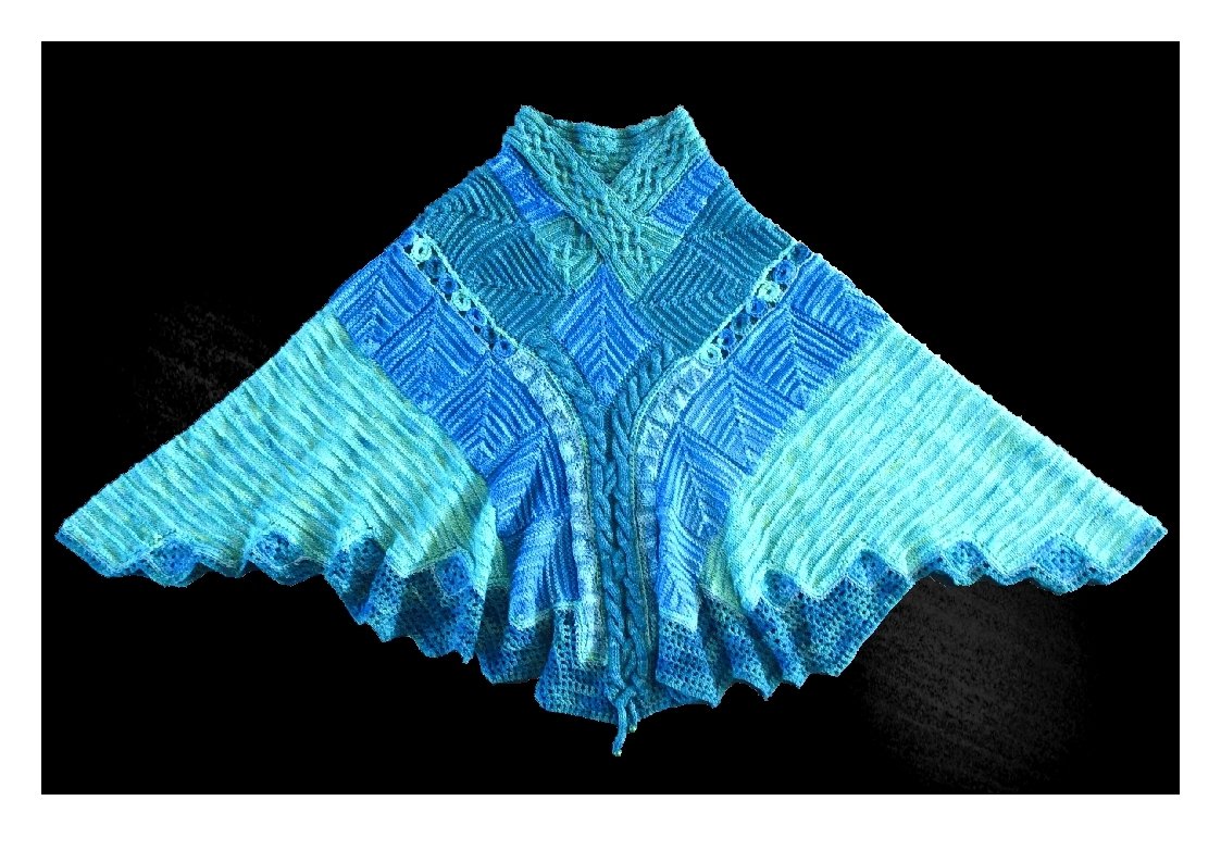Der Kobold ist ein Poncho in Patchworktechnik. Er besteht aus über fünfzig kleinen und großen Modulen und zusätzlichen gestrickten und gehäkelten Elementen, die zum überwiegenden Teil direkt miteinander verbunden werden. Nur wenige Zier-Elemente müssen mit der Nähnadel befestigt werden.