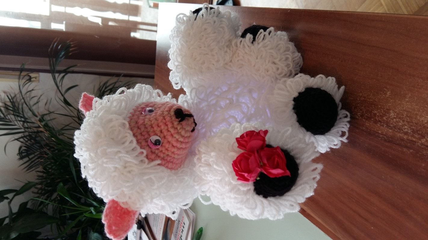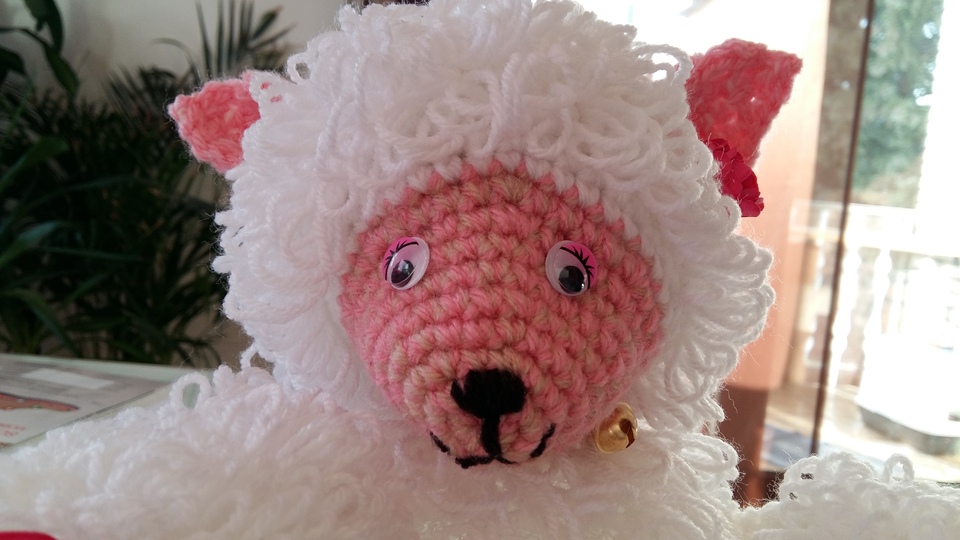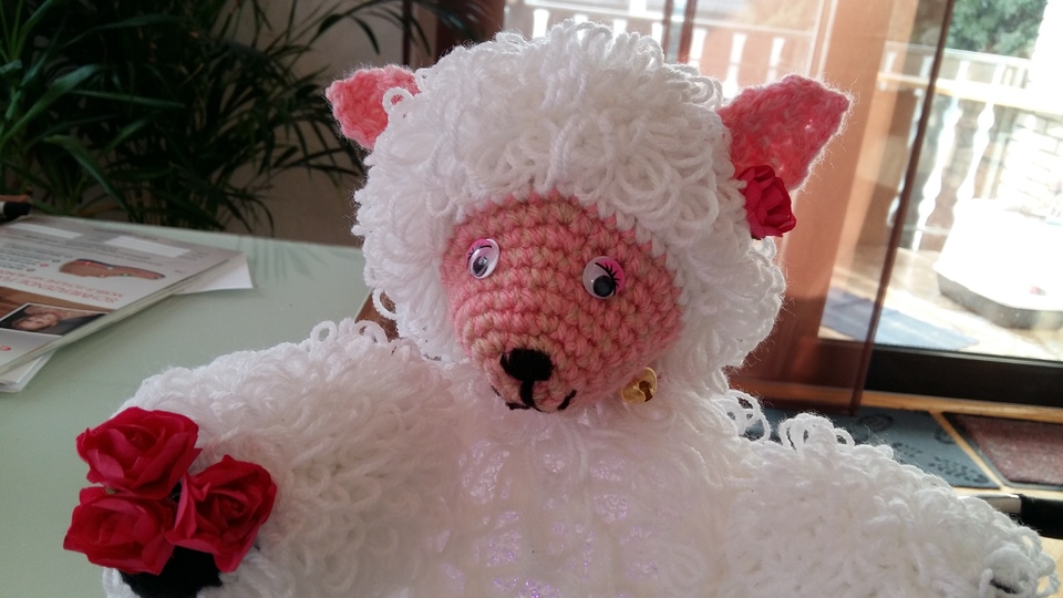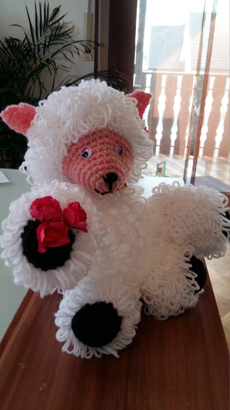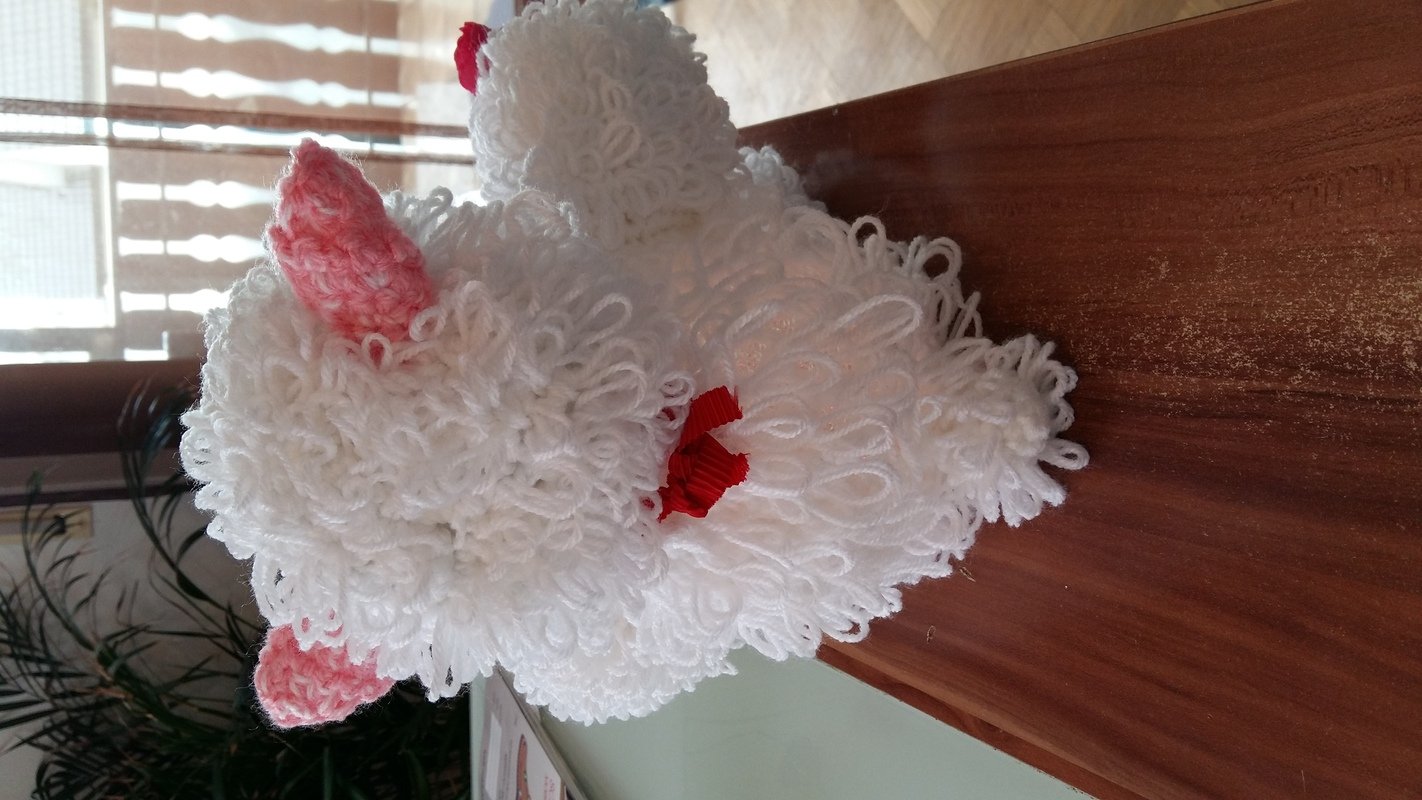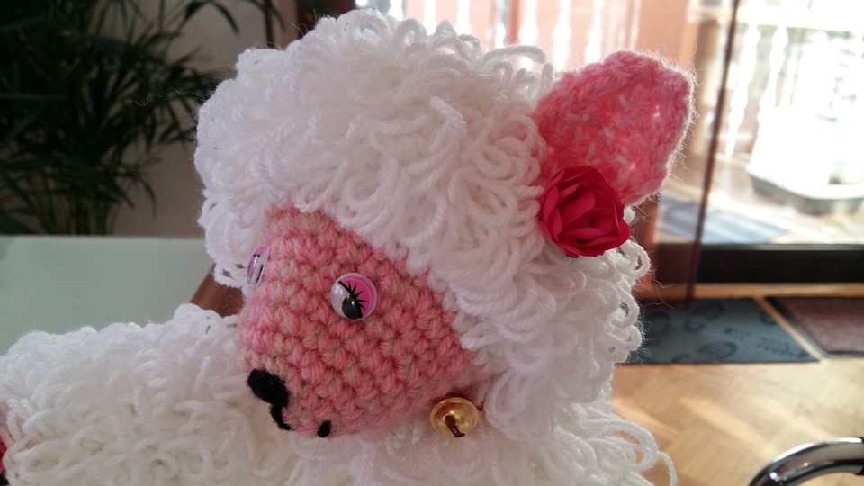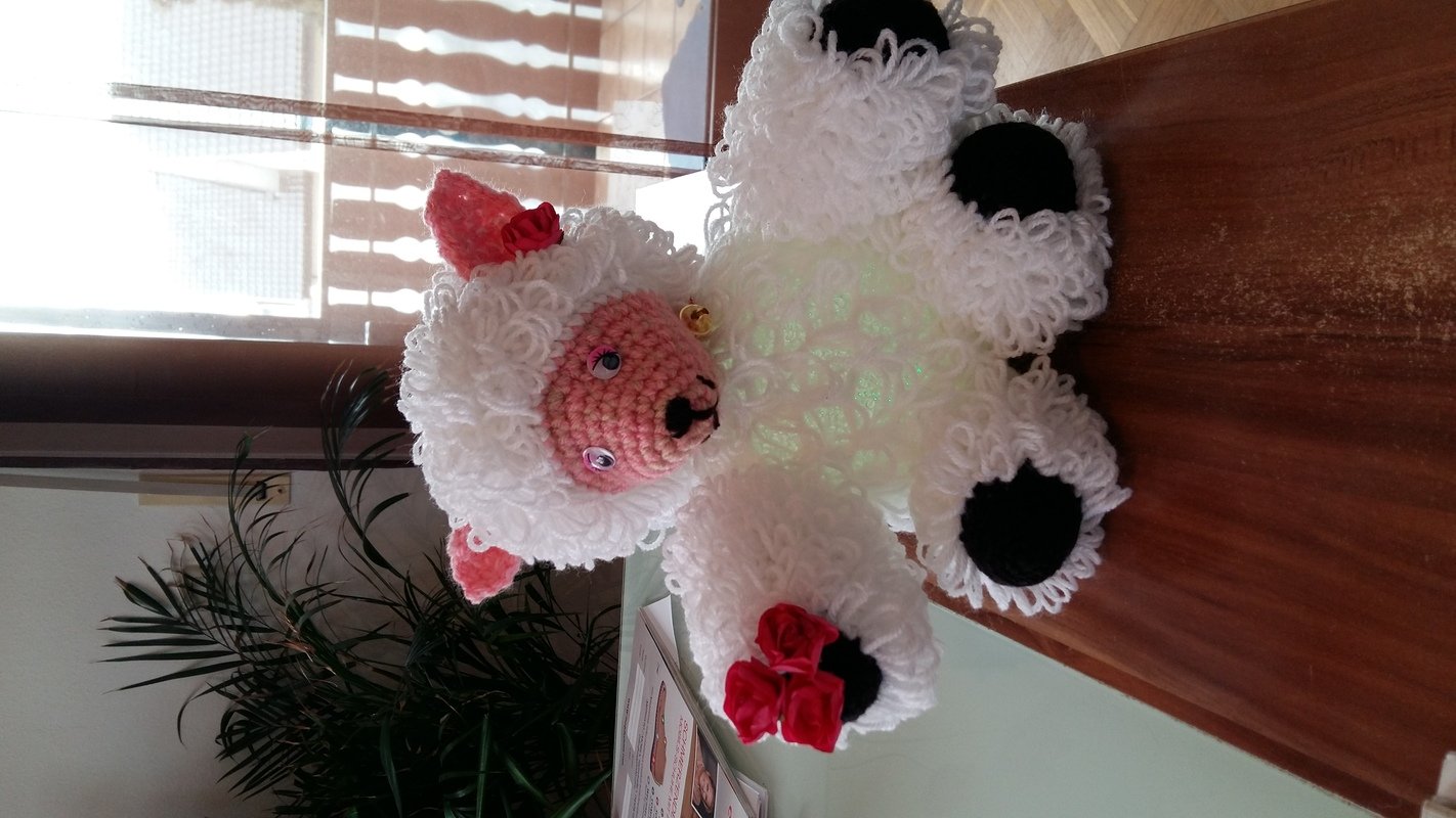 Der Bauch ist eine LED Lampe mit Farbwechsler ( eine Acryl Kugel mit LED Lichterkette geht auch ) . Der Körper wurde aus doppeltem Garn gehäckelt , es wurden Schlaufenmaschen angewendet . So entstand die Optik des Felles .