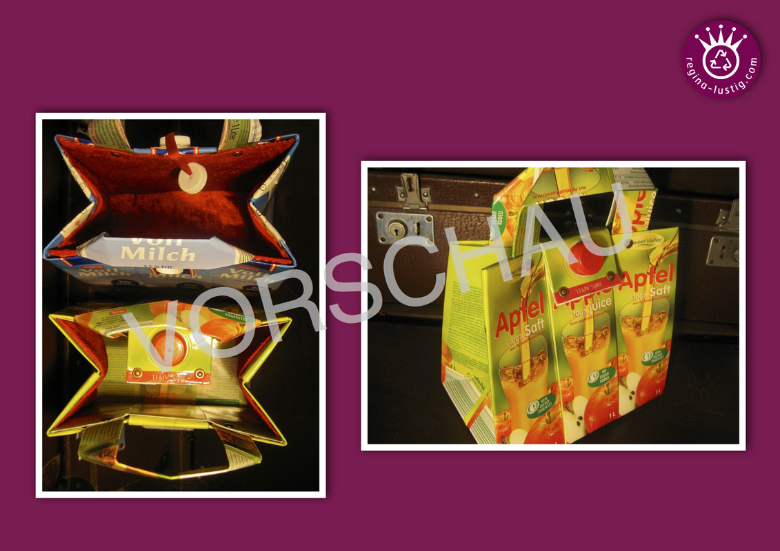 Diese Taschen kannst Du, ohne einen einzigen Stich zu nähen, nach einem Grundmodell gestalten. Die Vollmilch-Tasche hat ein edles Stoff-Innenleben und wird mit zwei Schraubverschlüssen geöffnet und verschlossen. Die Apfelsaft-Tasche hat einen Klettverschluss und ein witziges, winziges Geheimfach.