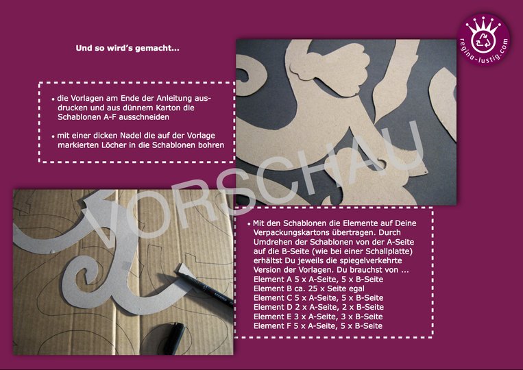 Diese Anleitung beinhaltet die genaue Erklärung der Arbeitsschritte mit vielen Fotos, Vorlagen zum Ausdrucken, Tipps und Tricks, sowie eine Material- und Werkzeugliste.